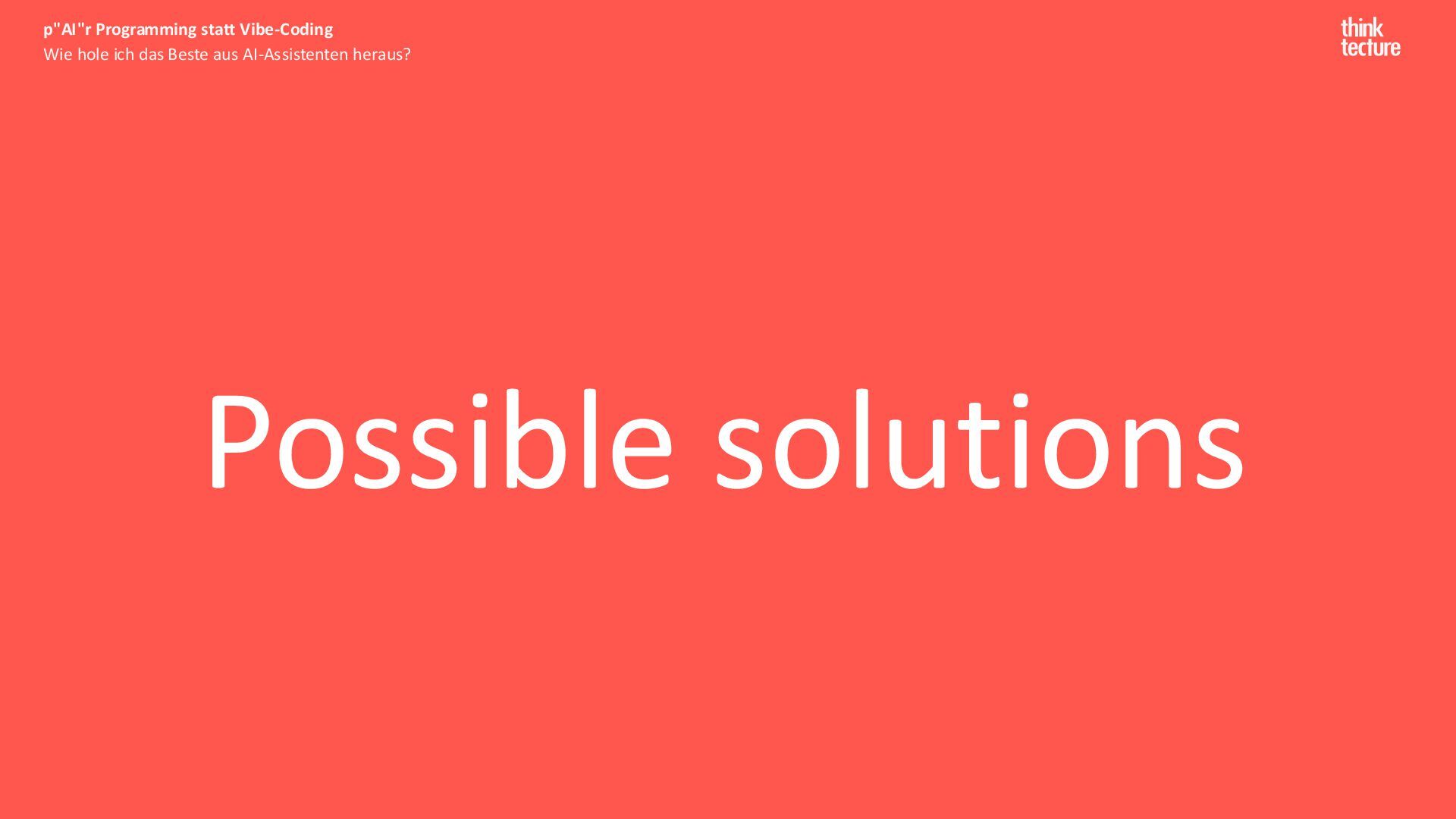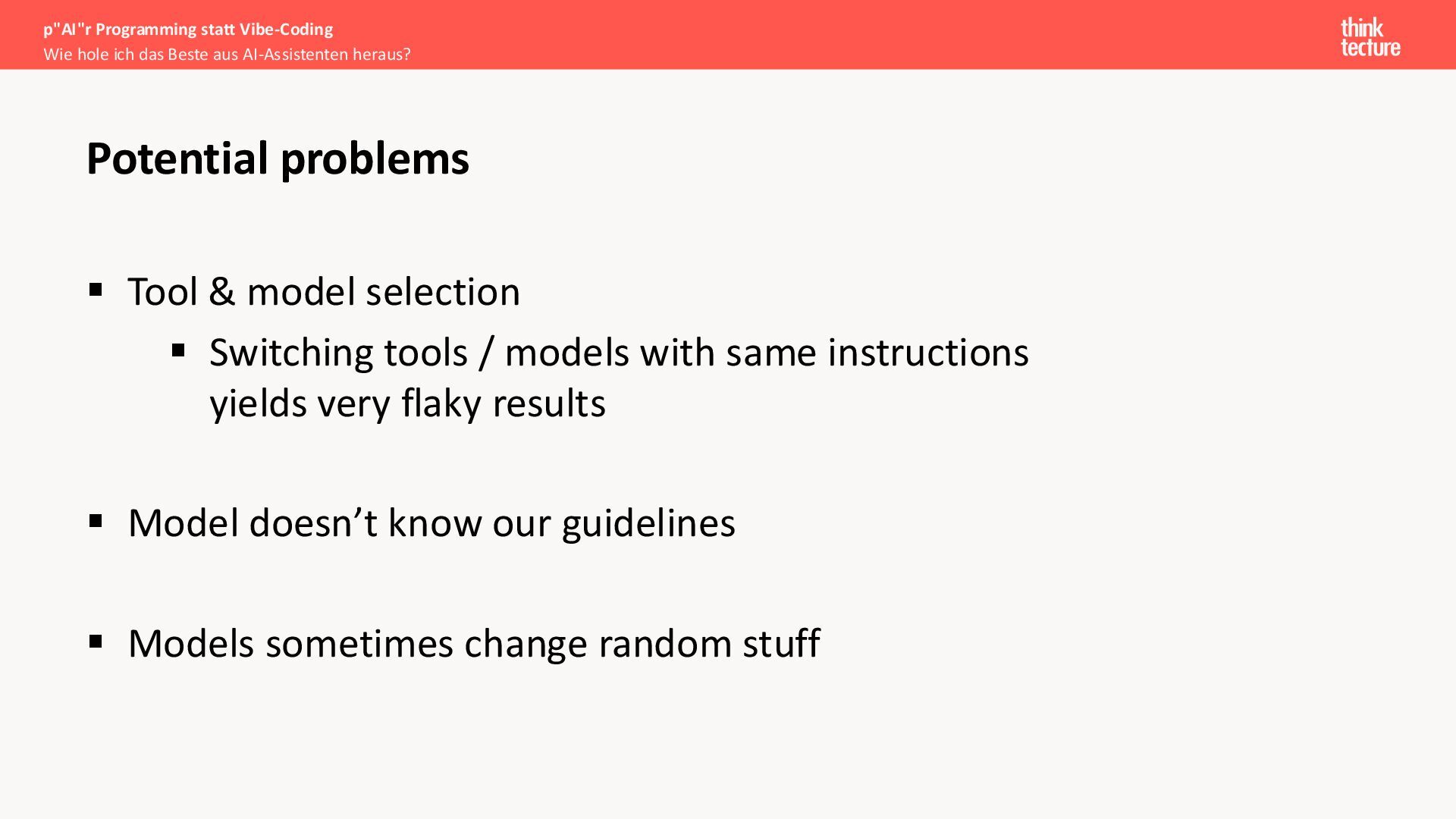 / models with same instructions yields very flaky results ▪ Model doesn’t know our guidelines ▪ Models sometimes change random stuff Wie hole ich das Beste aus AI-Assistenten heraus? p"AI"r Programming statt Vibe-Coding