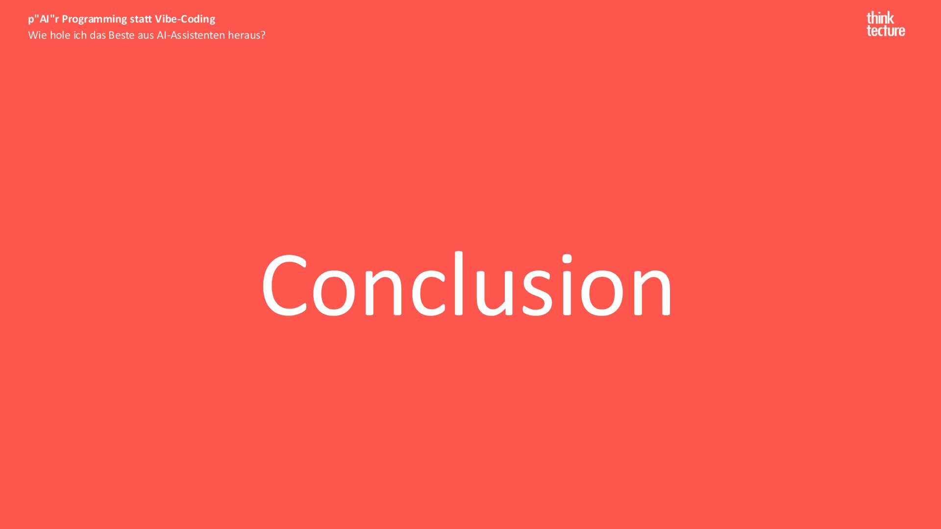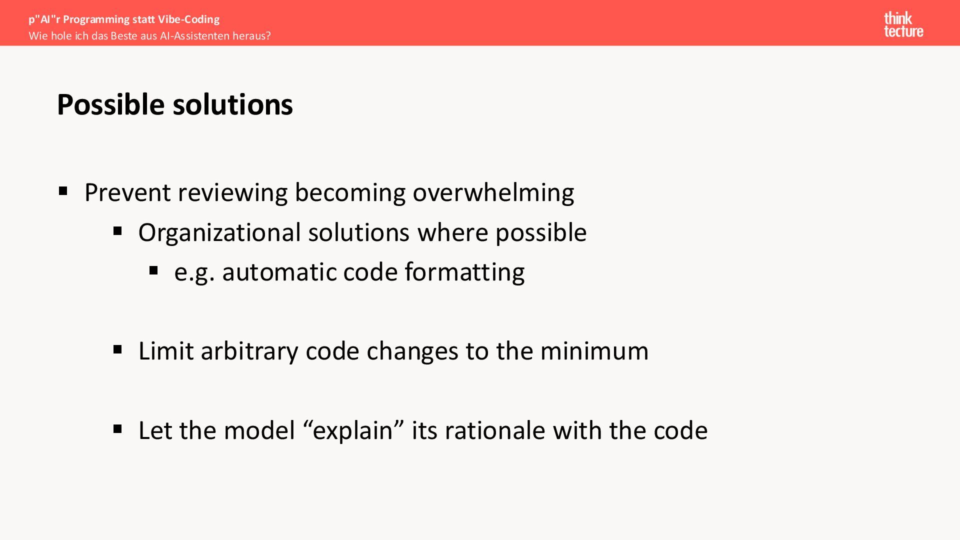 where possible ▪ e.g. automatic code formatting ▪ Limit arbitrary code changes to the minimum ▪ Let the model “explain” its rationale with the code Wie hole ich das Beste aus AI-Assistenten heraus? p"AI"r Programming statt Vibe-Coding
