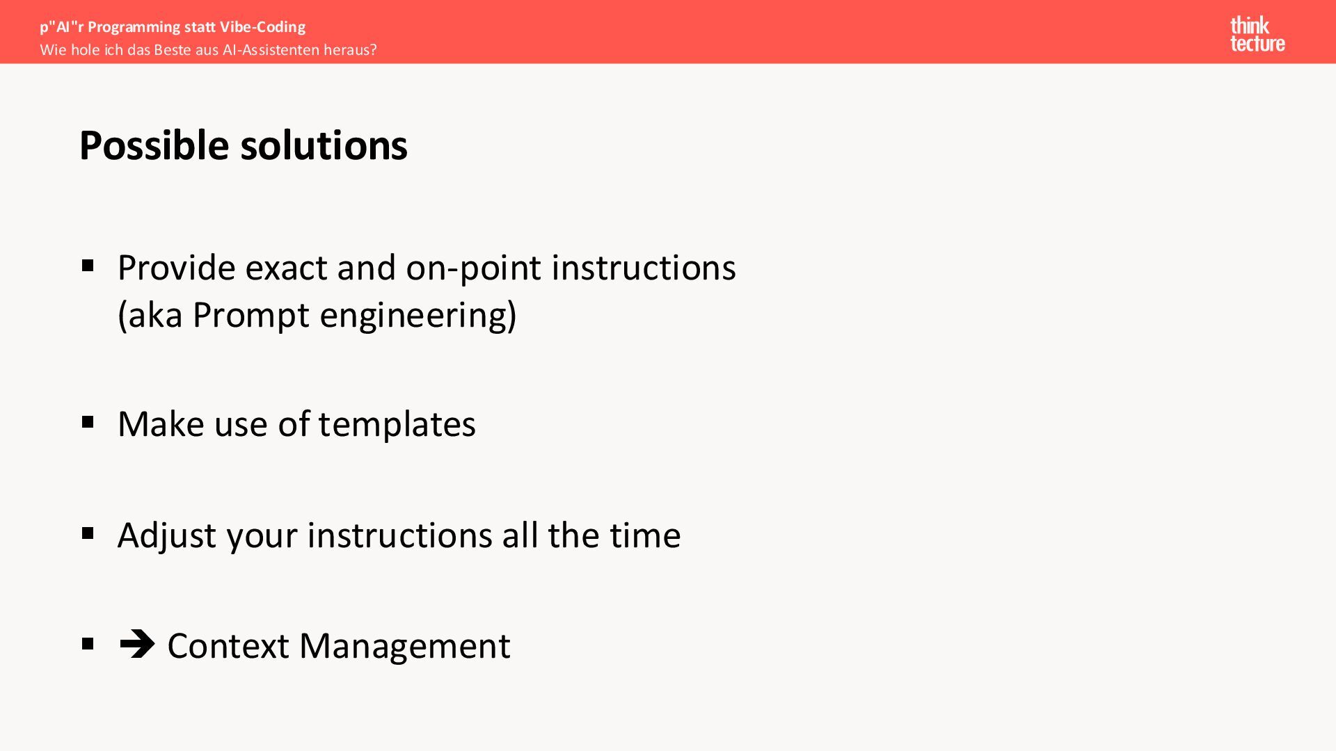 engineering) ▪ Make use of templates ▪ Adjust your instructions all the time ▪ ➔ Context Management Wie hole ich das Beste aus AI-Assistenten heraus? p"AI"r Programming statt Vibe-Coding