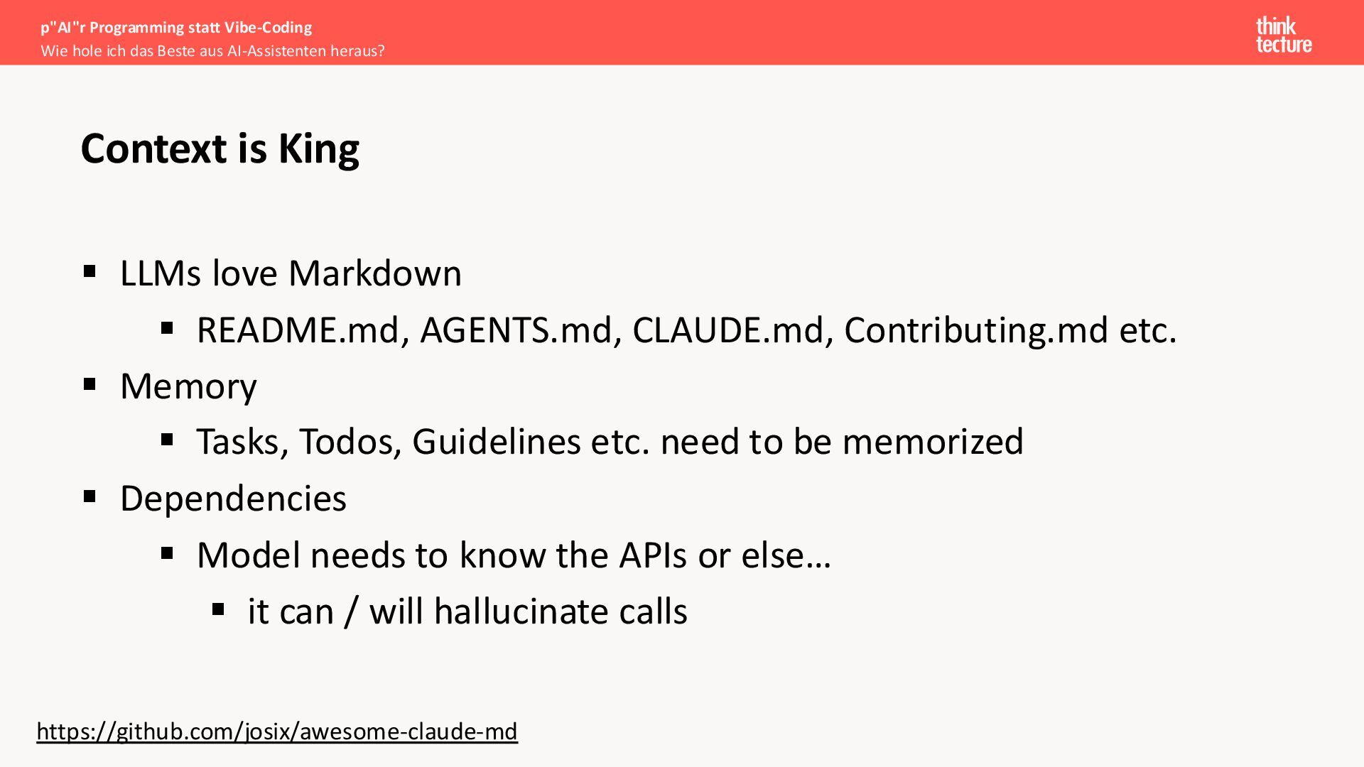CLAUDE.md, Contributing.md etc. ▪ Memory ▪ Tasks, Todos, Guidelines etc. need to be memorized ▪ Dependencies ▪ Model needs to know the APIs or else… ▪ it can / will hallucinate calls https://github.com/josix/awesome-claude-md Wie hole ich das Beste aus AI-Assistenten heraus? p"AI"r Programming statt Vibe-Coding