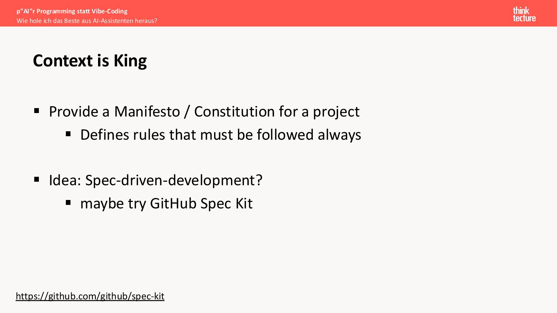 a project ▪ Defines rules that must be followed always ▪ Idea: Spec-driven-development? ▪ maybe try GitHub Spec Kit https://github.com/github/spec-kit Wie hole ich das Beste aus AI-Assistenten heraus? p"AI"r Programming statt Vibe-Coding