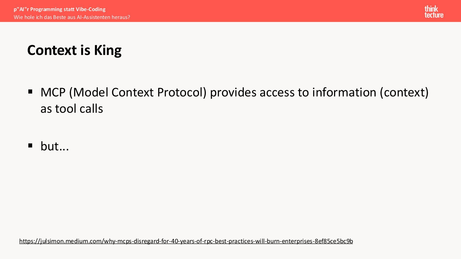 to information (context) as tool calls ▪ but... Wie hole ich das Beste aus AI-Assistenten heraus? p"AI"r Programming statt Vibe-Coding https://julsimon.medium.com/why-mcps-disregard-for-40-years-of-rpc-best-practices-will-burn-enterprises-8ef85ce5bc9b