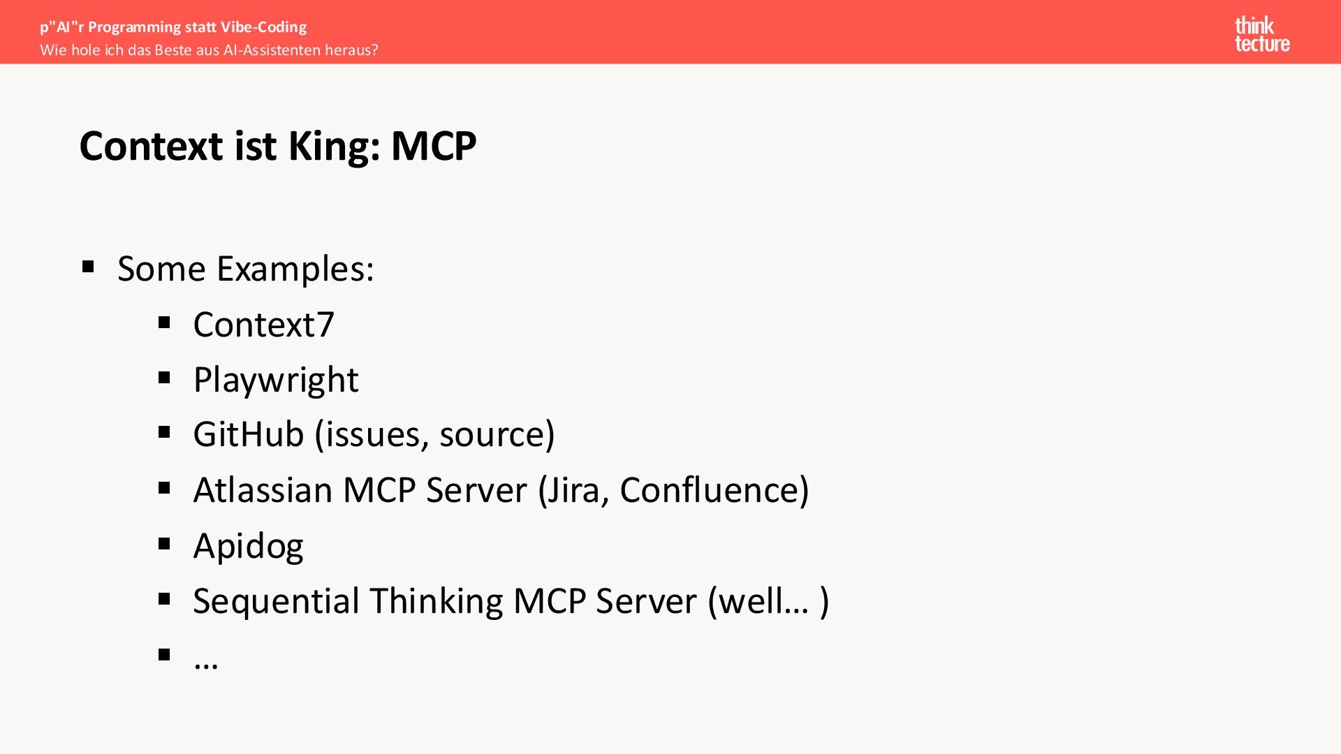 Playwright ▪ GitHub (issues, source) ▪ Atlassian MCP Server (Jira, Confluence) ▪ Apidog ▪ Sequential Thinking MCP Server (well… ) ▪ … Wie hole ich das Beste aus AI-Assistenten heraus? p"AI"r Programming statt Vibe-Coding