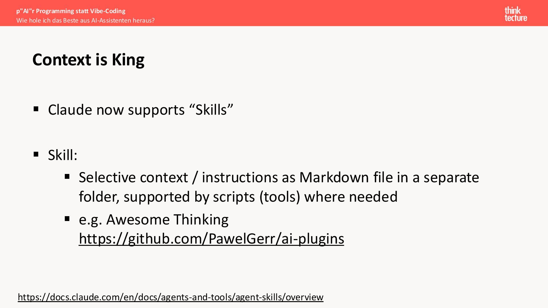 ▪ Selective context / instructions as Markdown file in a separate folder, supported by scripts (tools) where needed ▪ e.g. Awesome Thinking https://github.com/PawelGerr/ai-plugins https://docs.claude.com/en/docs/agents-and-tools/agent-skills/overview Wie hole ich das Beste aus AI-Assistenten heraus? p"AI"r Programming statt Vibe-Coding