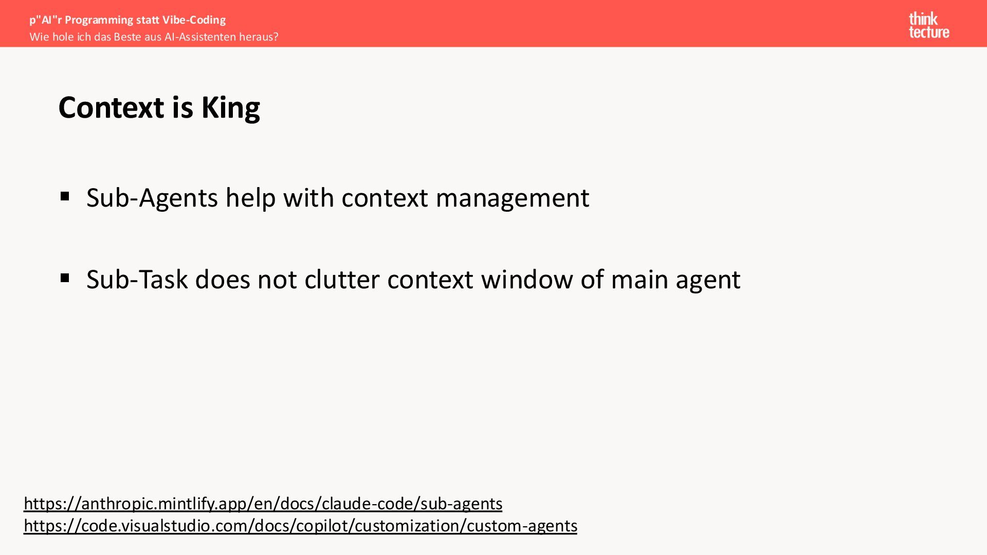 Sub-Task does not clutter context window of main agent https://anthropic.mintlify.app/en/docs/claude-code/sub-agents https://code.visualstudio.com/docs/copilot/customization/custom-agents Wie hole ich das Beste aus AI-Assistenten heraus? p"AI"r Programming statt Vibe-Coding
