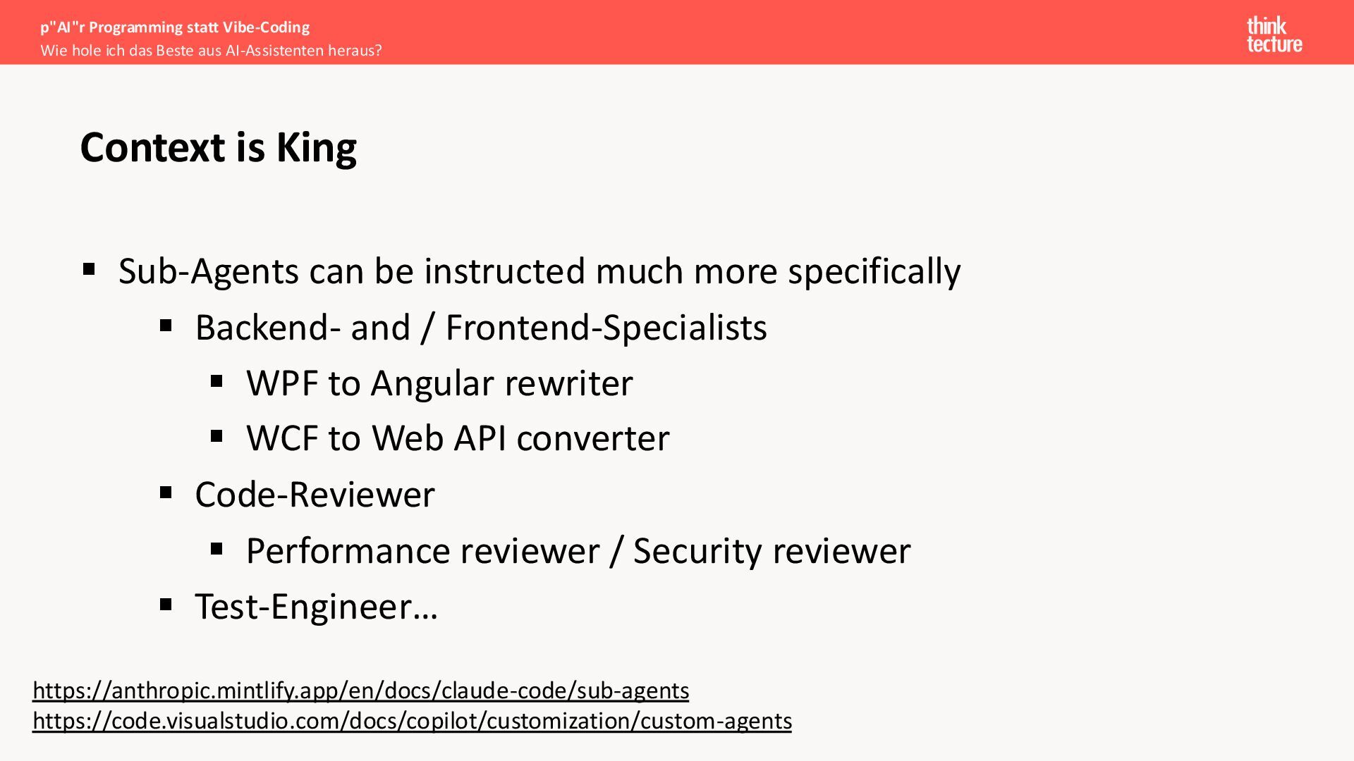 specifically ▪ Backend- and / Frontend-Specialists ▪ WPF to Angular rewriter ▪ WCF to Web API converter ▪ Code-Reviewer ▪ Performance reviewer / Security reviewer ▪ Test-Engineer… Wie hole ich das Beste aus AI-Assistenten heraus? p"AI"r Programming statt Vibe-Coding https://anthropic.mintlify.app/en/docs/claude-code/sub-agents https://code.visualstudio.com/docs/copilot/customization/custom-agents