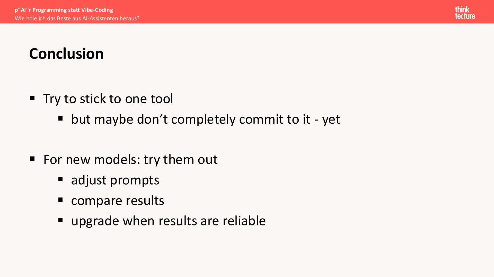 maybe don’t completely commit to it - yet ▪ For new models: try them out ▪ adjust prompts ▪ compare results ▪ upgrade when results are reliable Wie hole ich das Beste aus AI-Assistenten heraus? p"AI"r Programming statt Vibe-Coding