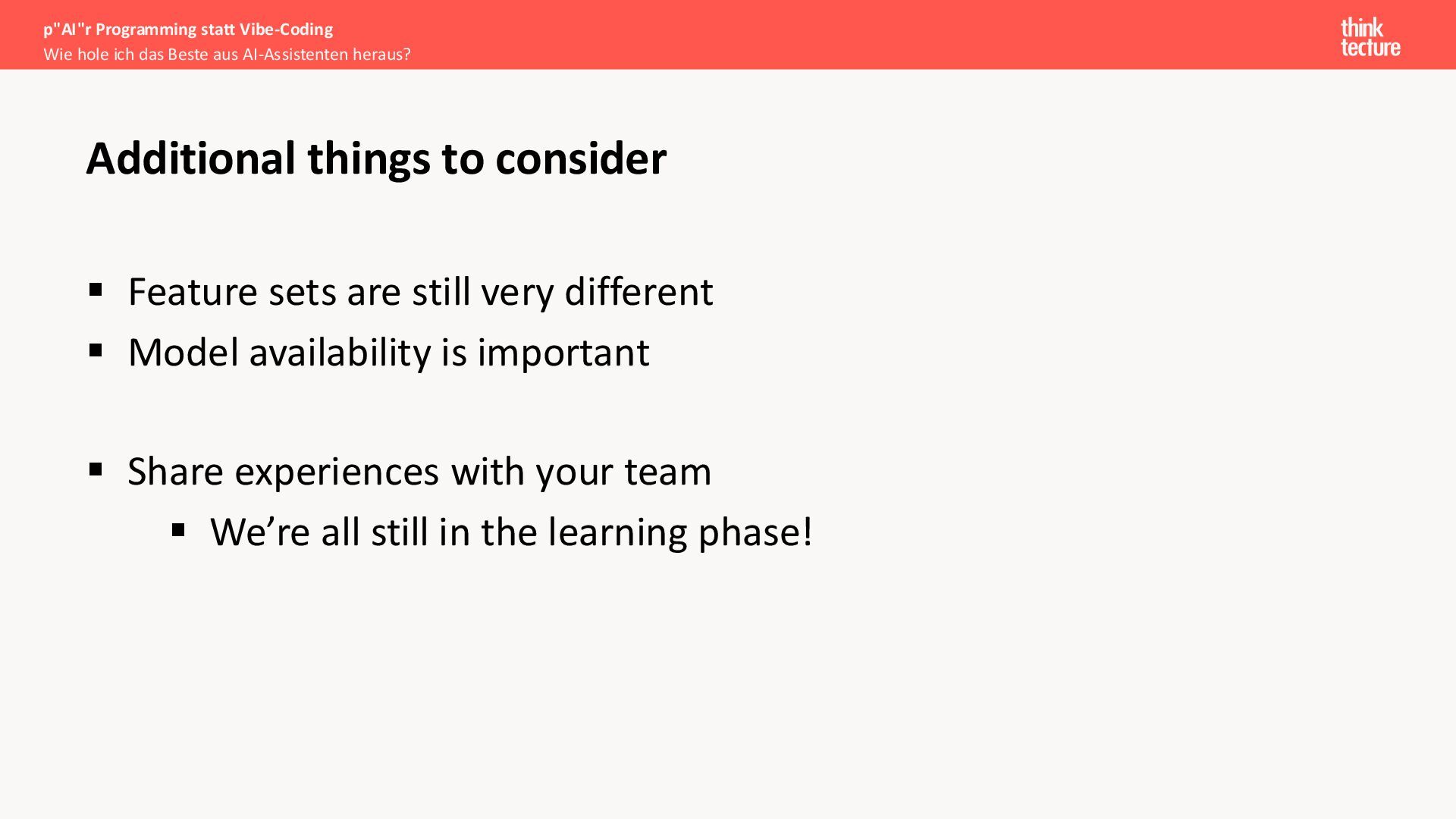 different ▪ Model availability is important ▪ Share experiences with your team ▪ We’re all still in the learning phase! Wie hole ich das Beste aus AI-Assistenten heraus? p"AI"r Programming statt Vibe-Coding