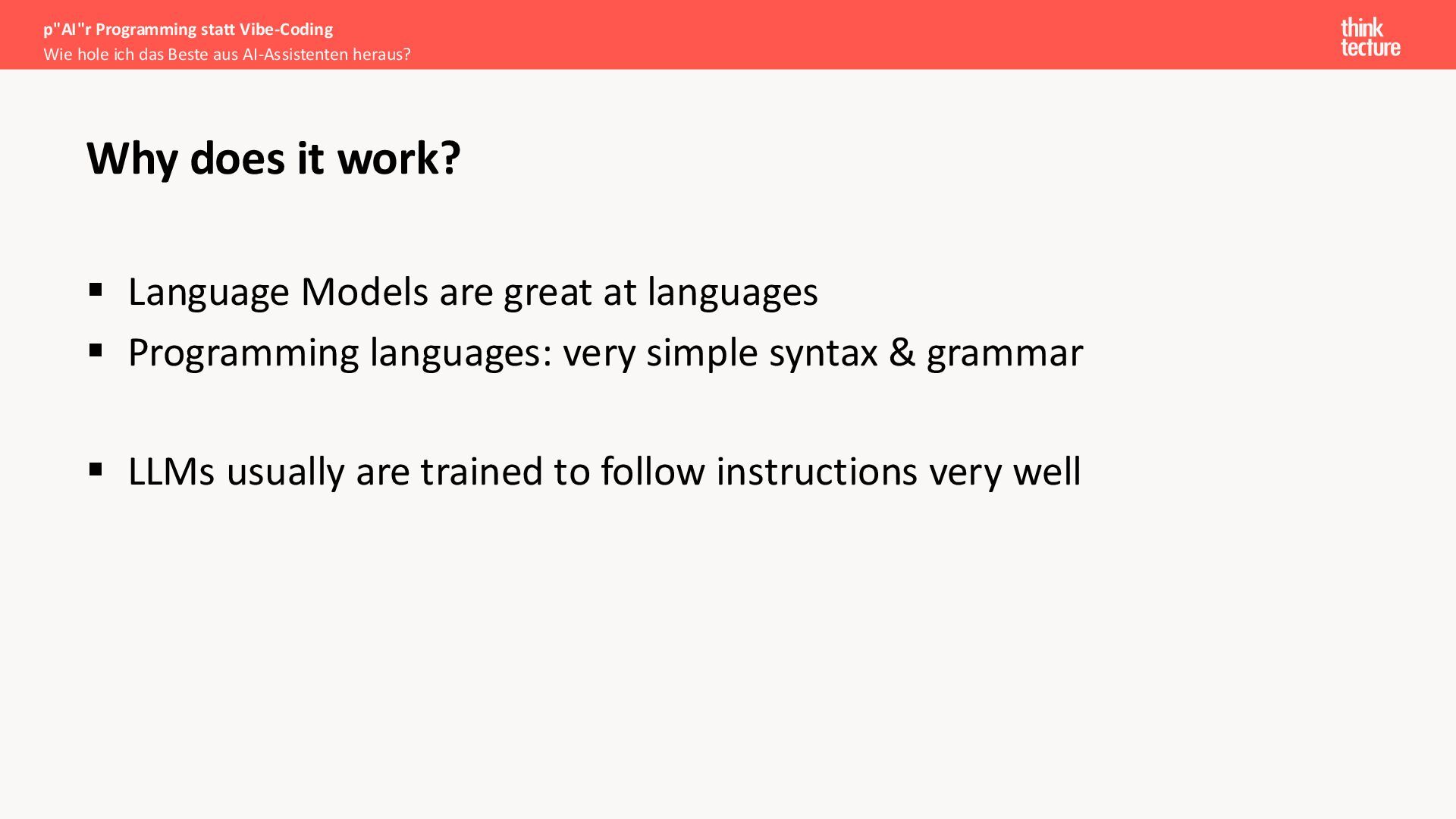 languages ▪ Programming languages: very simple syntax & grammar ▪ LLMs usually are trained to follow instructions very well Wie hole ich das Beste aus AI-Assistenten heraus? p"AI"r Programming statt Vibe-Coding