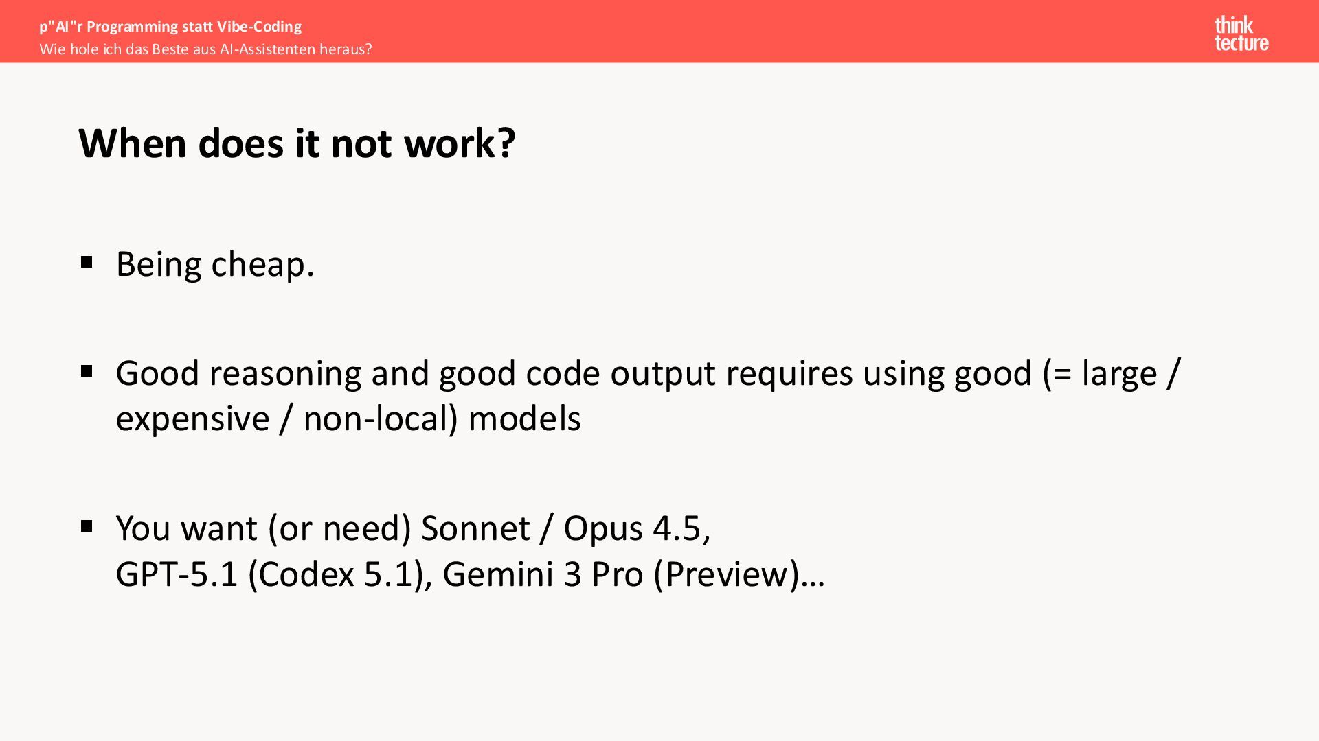 reasoning and good code output requires using good (= large / expensive / non-local) models ▪ You want (or need) Sonnet / Opus 4.5, GPT-5.1 (Codex 5.1), Gemini 3 Pro (Preview)… Wie hole ich das Beste aus AI-Assistenten heraus? p"AI"r Programming statt Vibe-Coding