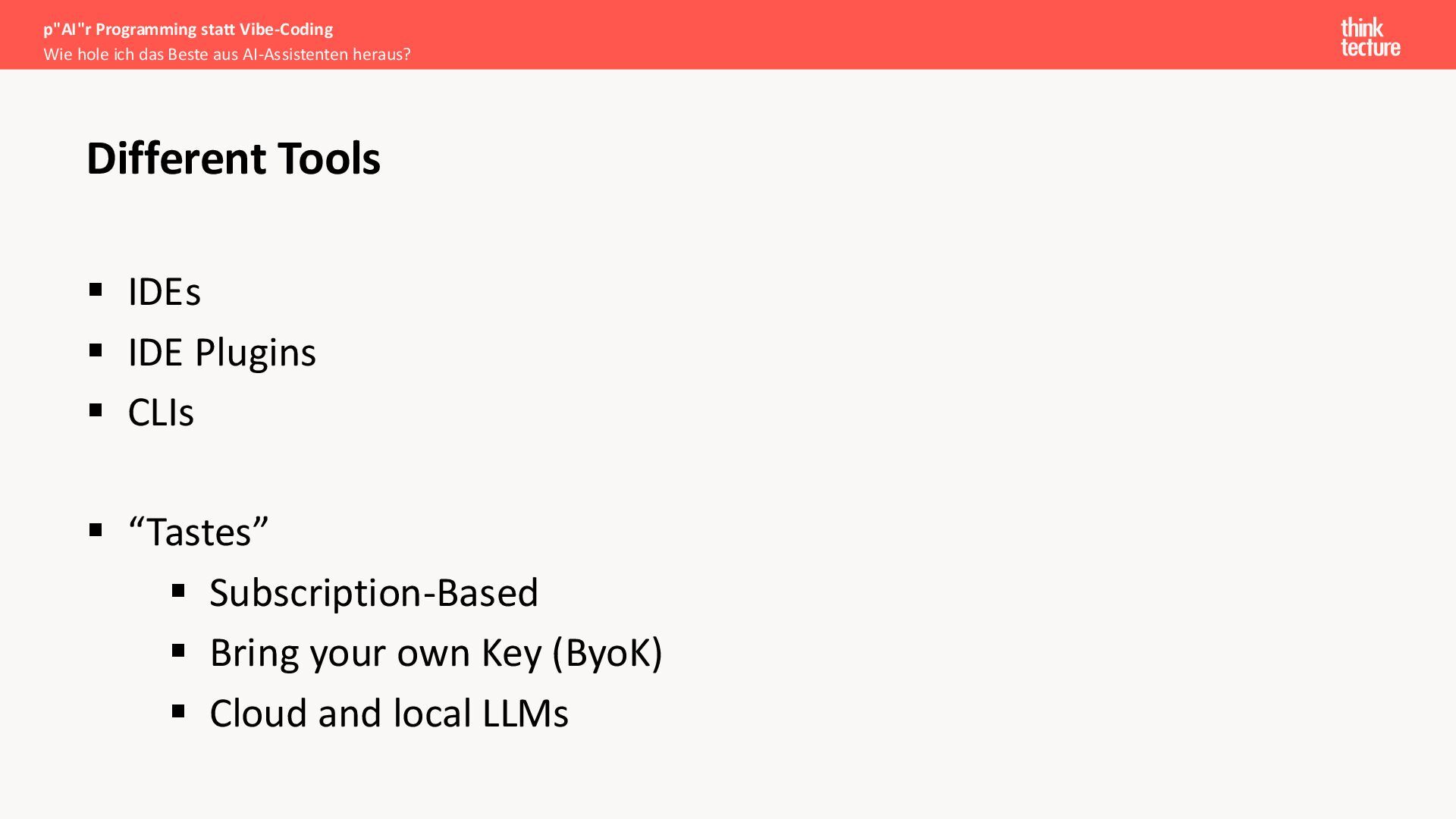 “Tastes” ▪ Subscription-Based ▪ Bring your own Key (ByoK) ▪ Cloud and local LLMs Wie hole ich das Beste aus AI-Assistenten heraus? p"AI"r Programming statt Vibe-Coding