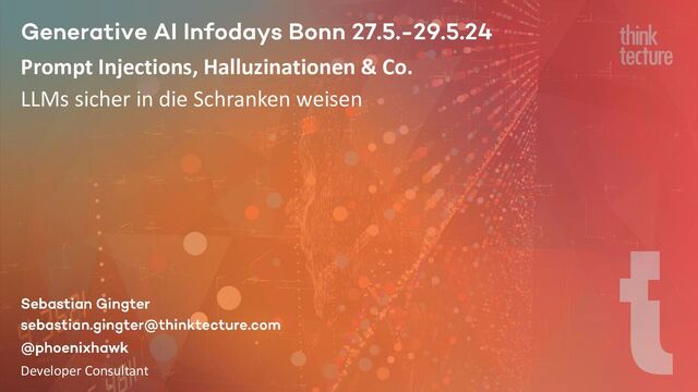 & outputs ▪ Limit length of request, untrusted data and response ▪ Threat modelling (i.e. Content Security Policy/CSP) ▪ Guard your system ▪ Content filtering & moderation ▪ Use another LLM (call) to validate ▪ Keep the human in the loop LLMs sicher in die Schranken weisen Possible Solutions
