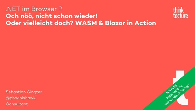 ▪ Because JavaScript (but not a replacement for JavaScript!) ▪ Bring any language into the browser ▪ Superior performance ▪ Goals ▪ Fast, efficient, portable ▪ Readable and debuggable ▪ Use existing sandboxing tools ▪ Don’t break the web ▪ Binary (.wasm) & text (.wat) format ▪ Officially open source ▪ http://webassembly.github.io/spec/core/index.html .NET im Browser