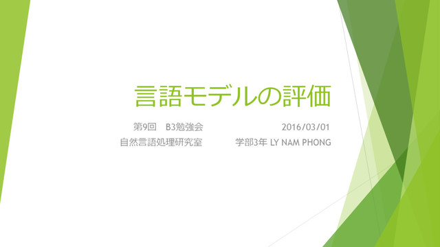 言語モデルの評価 第9回 B3勉強会 2016/03/01 自然言語処理研究室 学部3年 LY NAM PHONG