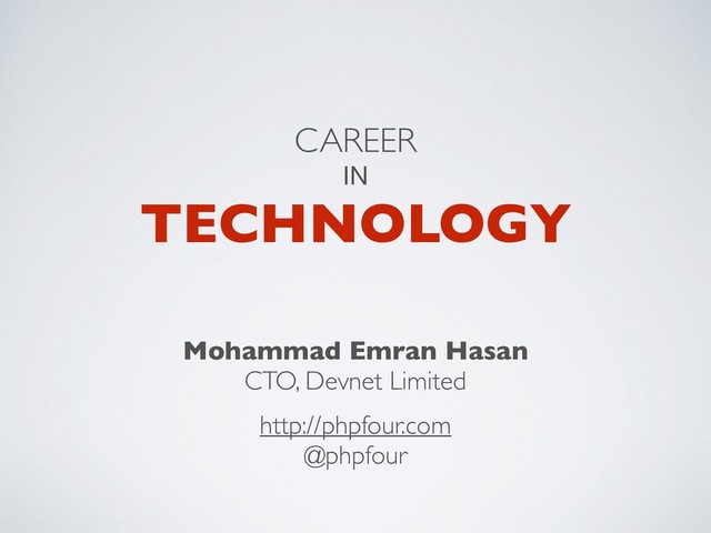 CAREER IN TECHNOLOGY Mohammad Emran Hasan CTO, Devnet Limited http://phpfour.com