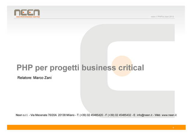 In questo talk verranno presentate le caratteristiche di un progetto business critical e come soddisfarle utilizzando un'infrastruttura PHP. Le necessità durante la fase di sviluppo, il time to market e la qualità del codice. Un ambiente di produzione che garantisce un deploy più veloce e con garanzia di consistenza e facili roll back. Alta affidabilità in produzione, garanzia di uptime sia a livello infrastrutturale che applicativo. Performance e scalabilità, con strumenti di monitoraggio e misurazione. Evidenzieremo come queste necessità possano essere pienamente soddisfatte da PHP, attraverso l'uso di Framework, opportune metodologie di sviluppo e adeguati ambienti e soluzioni sistemistiche. Presenteremo infine due casi reali di progetti business critical sviluppati in PHP e mantenuti in infrastrutture ad alta affidabilità. Il primo sviluppato in Symfony (UCI Cinemas), il secondo sviluppato in Zend Framework (Morellato).