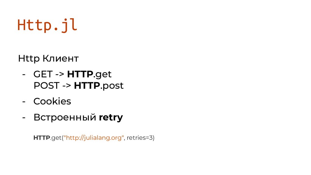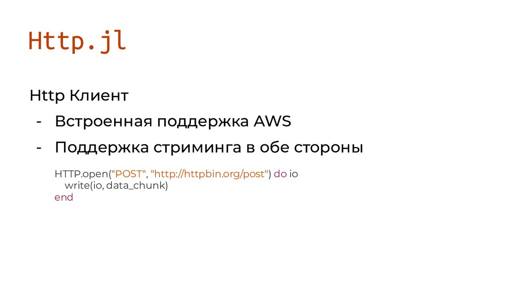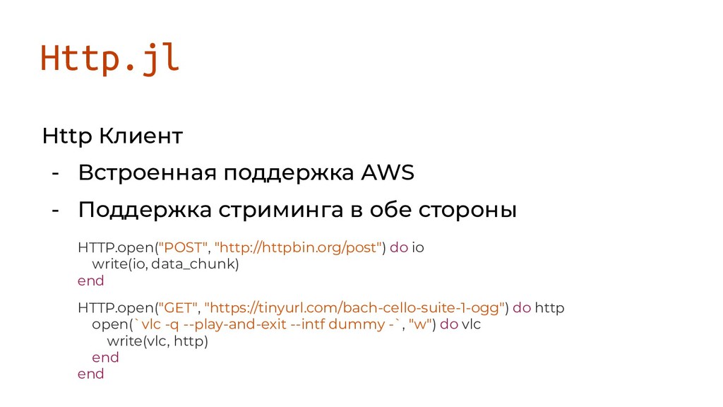 в обе стороны HTTP.open("POST", "http://httpbin.org/post") do io write(io, data_chunk) end HTTP.open("GET", "https://tinyurl.com/bach-cello-suite-1-ogg") do http open(`vlc -q --play-and-exit --intf dummy -`, "w") do vlc write(vlc, http) еnd end