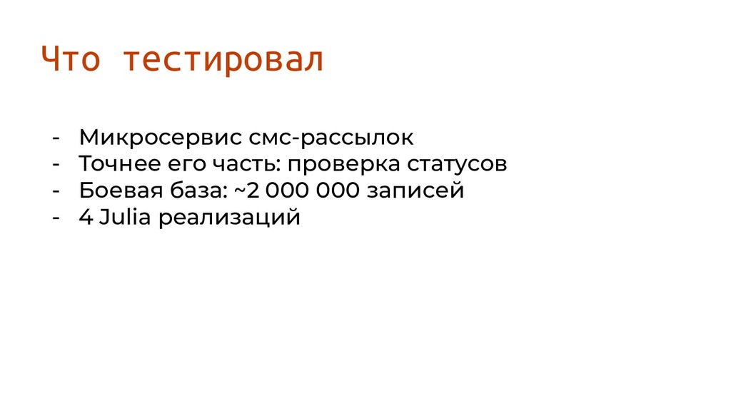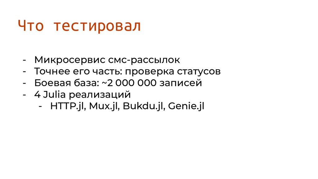 статусов - Боевая база: ~2 000 000 записей - 4 Julia реализаций - HTTP.jl, Mux.jl, Bukdu.jl, Genie.jl
