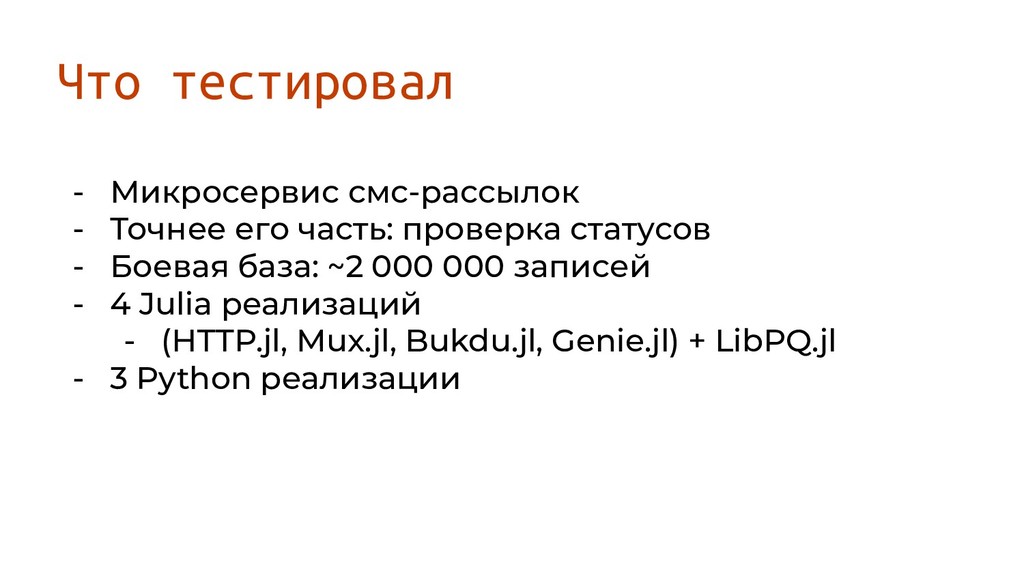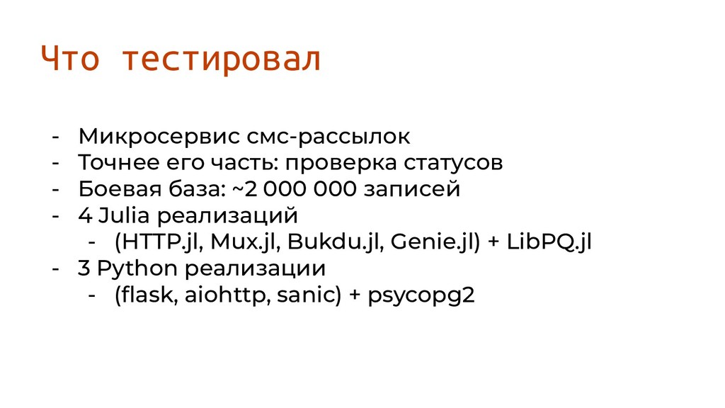 Боевая база: ~2 000 000 записей - 4 Julia реализаций - (HTTP.jl, Mux.jl, Bukdu.jl, Genie.jl) + LibPQ.jl - 3 Python реализации Что тестировал