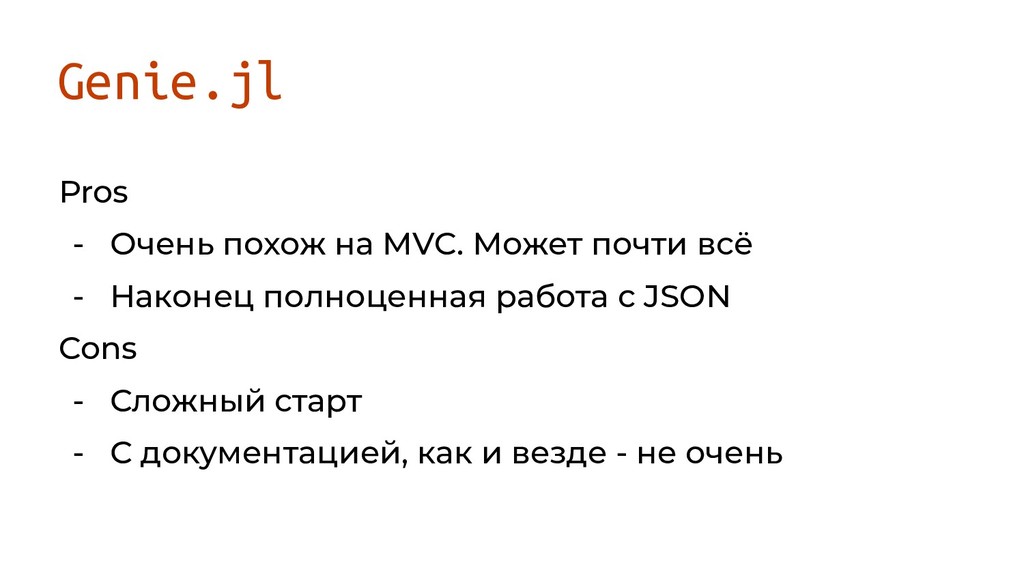 Genie.jl Pros - Очень похож на MVC. Может почти всё