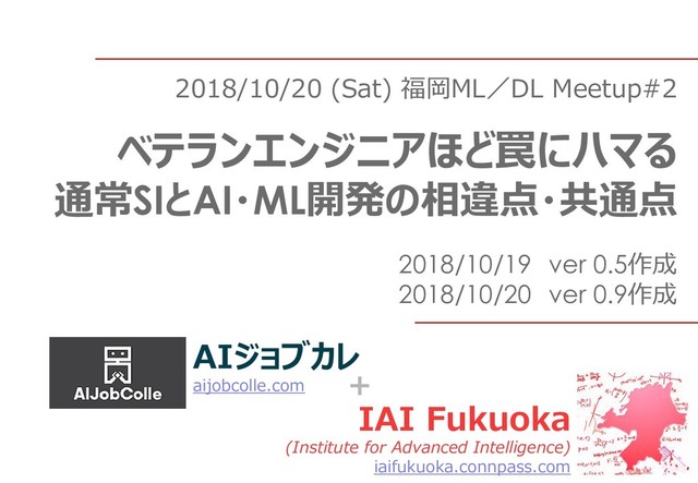 1. 2018/10/20 (Sat) 福岡ML/DL Meetup#2 ベテランエンジニアほど罠にハマる 通常SIとAI・ML開発の相違点・共通点 2018/10/19 ver 0.5作成 2018/10/20