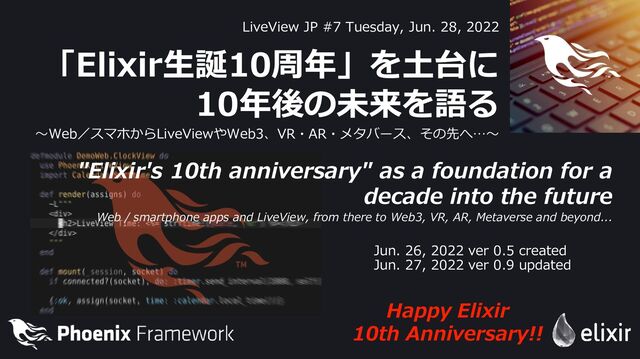 Jun. 28, 2022 「Elixir生誕10周年」を土台に 10年後の未来を語る ~Web/スマホからLiveViewやWeb3、VR・AR・メタバース、その先へ…~ Happy Elixir 10th Anniversary!! "Elixir's 10th anniversary" as a foundation for a decade into the future Web / smartphone apps and LiveView, from there to Web3, VR, AR, Metaverse and beyond... Jun. 26, 2022 ver 0.5 created Jun. 27, 2022 ver 0.9 updated