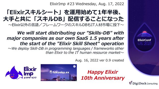 17, 2022 「Elixirスキルシート」を運用始めて1年半後、 大手と共に「スキルDB」配信することになった ~Elixir以外の言語/フレームワークのスキルDBもIT人材市場に投下~ We will start distributing our "Skills-DB" with major companies as our own SaaS 1.5 years after the start of the "Elixir Skill Sheet" operation ~We deploy Skill-DB in programming languages / frameworks other than Elixir to the IT human resource market~ Aug. 16, 2022 ver 0.9 created Happy Elixir 10th Anniversary