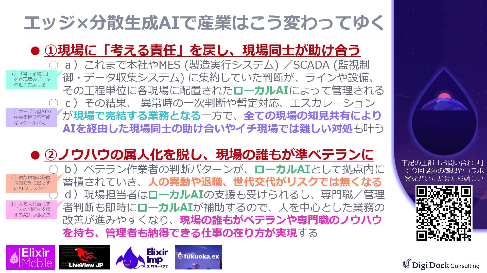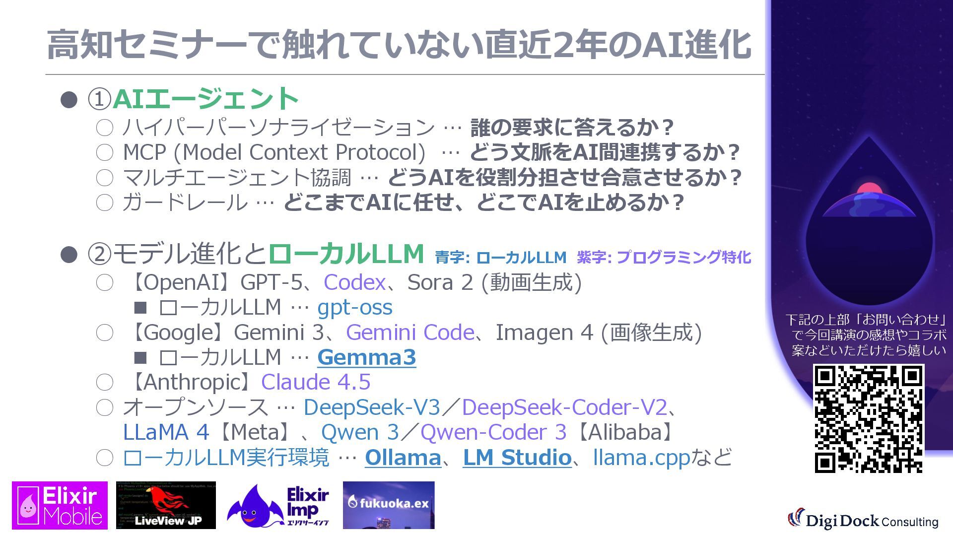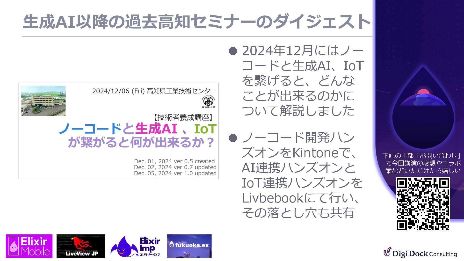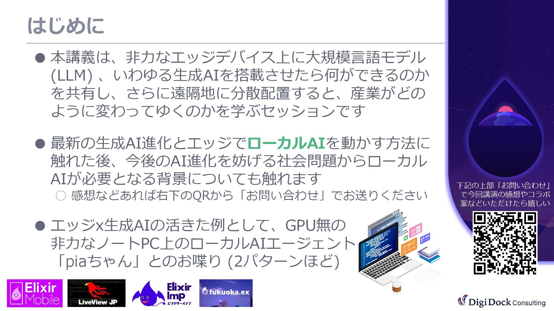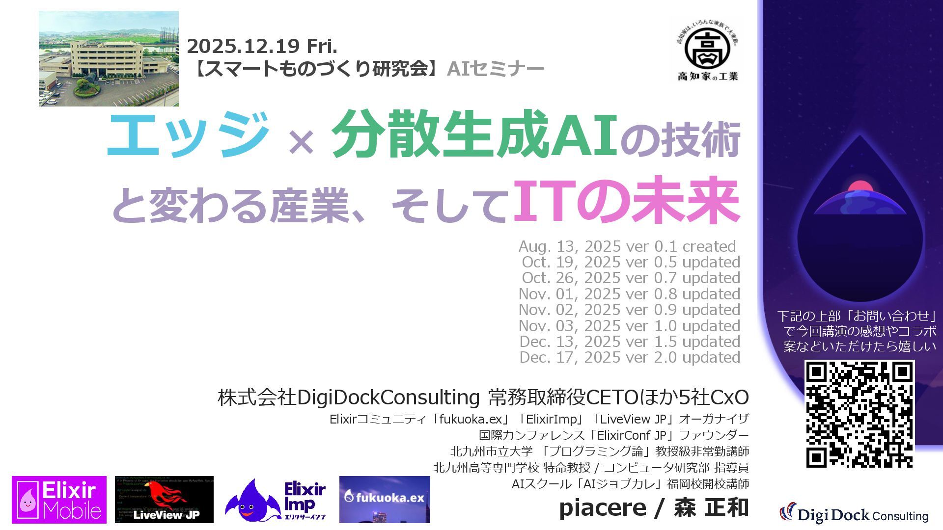 ver 0.1 created. Oct. 19, 2025 ver 0.5 updated Oct. 26, 2025 ver 0.7 updated Nov. 01, 2025 ver 0.8 updated Nov. 02, 2025 ver 0.9 updated Nov. 03, 2025 ver 1.0 updated Dec. 13, 2025 ver 1.5 updated Dec. 17, 2025 ver 2.0 updated 株式会社DigiDockConsulting 常務取締役CETOほか5社CxO Elixirコミュニティ「fukuoka.ex」「ElixirImp」「LiveView JP」オーガナイザ 国際カンファレンス「ElixirConf JP」ファウンダー 北九州市立大学 「プログラミング論」教授級非常勤講師 北九州高等専門学校 特命教授 / コンピュータ研究部 指導員 AIスクール「AIジョブカレ」福岡校開校講師 piacere / 森 正和 2025.12.19 Fri. 【スマートものづくり研究会】AIセミナー