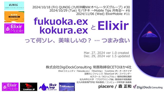 共有会〜 #6 2024/11/06 (Wed) ElixirMobile #11 と . って何ソレ、美味しいの? … つまみ食い Mar. 27, 2024 ver 1.0 created. Dec. 29, 2024 ver 1.5 updated 株式会社DigiDockConsulting 常務取締役CETOほか4社 Elixirコミュニティ「fukuoka.ex」「ElixirImp」「LiveView JP」オーガナイザ 国際カンファレンス「ElixirConf JP」ファウンダー AIスクール「AIジョブカレ」福岡校開校講師 北九州市立大学 「プログラミング論」教授級非常勤講師 北九州高等専門学校 特命教授 / コンピュータ研究部 指導員 piacere / 森 正和 fukuoka.ex kokura.ex Elixir