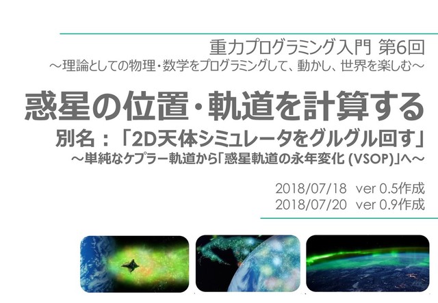= -G , r = √ x + y この移動速度の数式をコード化した以下は、数式そのままです ( 最近、関数型しか書いて無いので、状態を持てる・更新できる言語に拒否反応が(-_-u… ) … // 公転対象の位置から重力影響を計算し、速度を変更後、公転対象の位置を移動 moveOnGravityEffect: function() { var r = Math.sqrt( Math.pow( this.x, 2 ) + Math.pow( this.y, 2 ) ); this.dx = this.dx - G * M * this.x / Math.pow( r, 3 ); // x方向の移動速度 this.dy = this.dy - G * M * this.y / Math.pow( r, 3 ); // y方向の移動速度 this.x = this.x + this.dx; // x位置を、x方向の移動速度で更新 this.y = this.y + this.dy; // y位置を、y方向の移動速度で更新 }, … Mx r 3 My r 3 2 2 再掲
