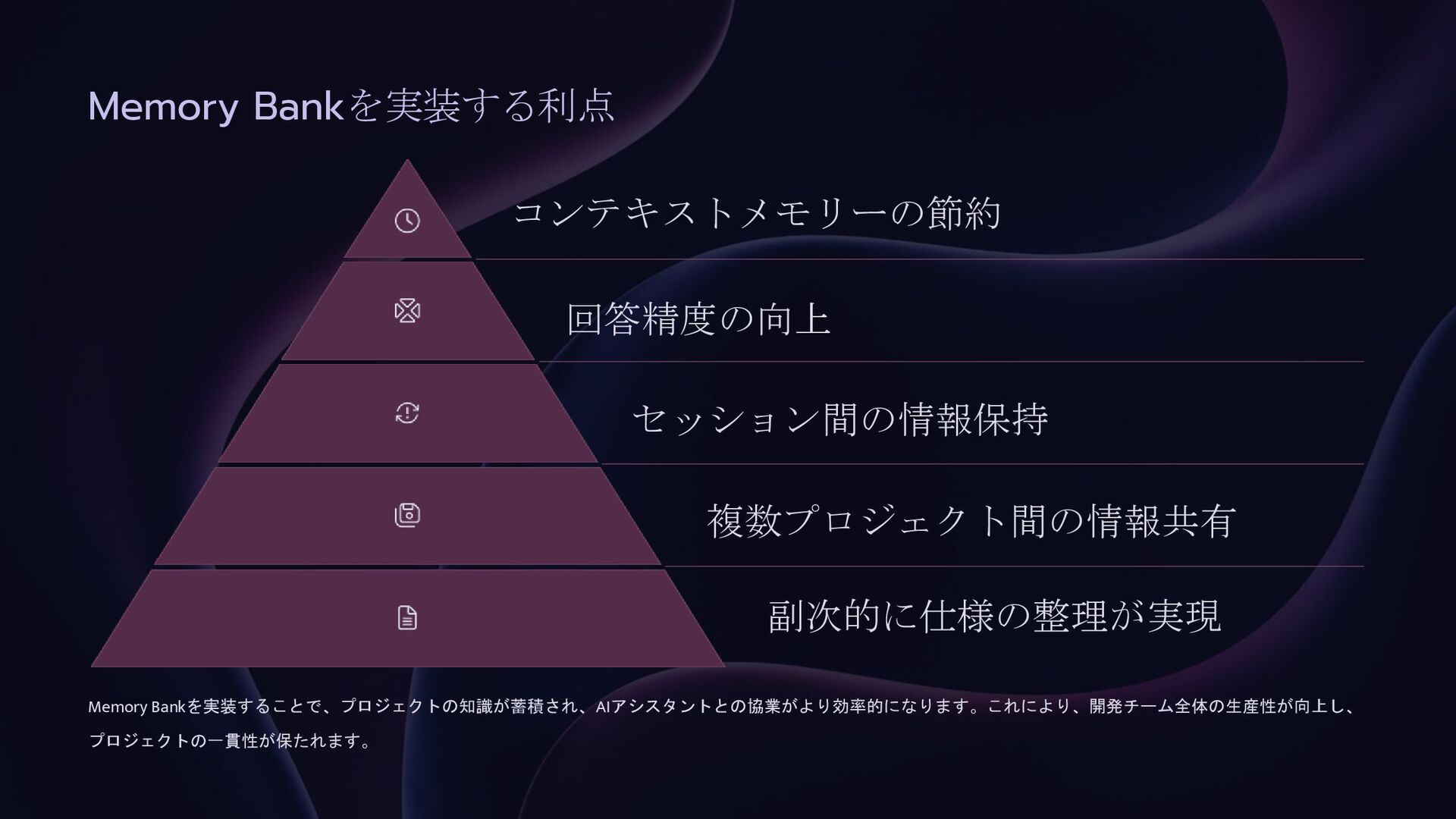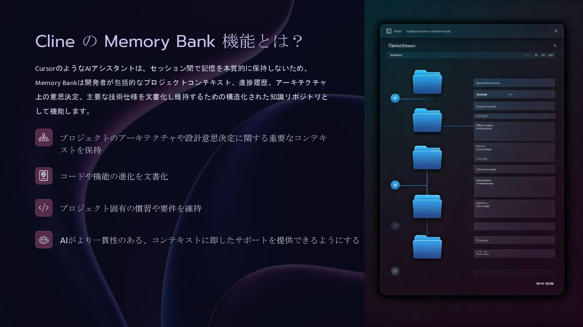 プロジェクトのアーキテクチャや設計意思決定に関する重要なコンテキ ストを保持 コードや機能の進化を文書化 プロジェクト固有の慣習や要件を維持 AIがより一貫性のある、コンテキストに即したサポートを提供できるようにする