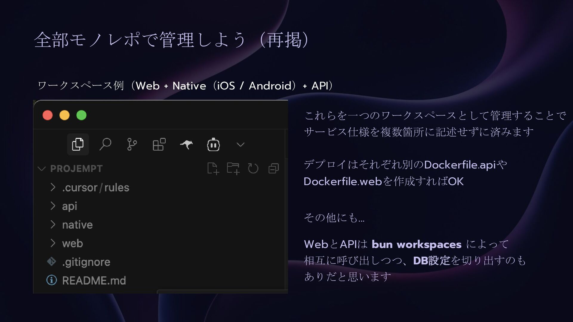 全部モノレポで管理しよう(再掲) これらを一つのワークスペースとして管理することで サービス仕様を複数箇所に記述せずに済みます ワークスペース例(Web + Native(iOS / Android)+ API) WebとAPIは