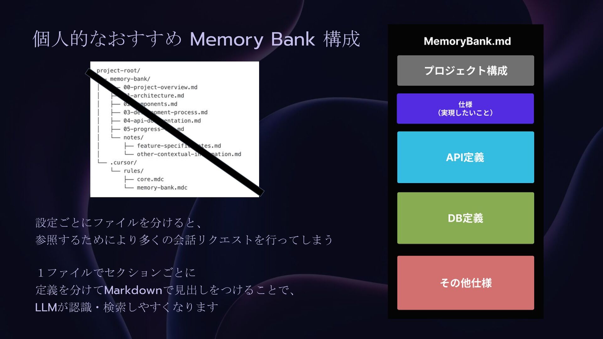 個人的なおすすめ Memory Bank 構成 設定ごとにファイルを分けると、 参照するためにより多くの会話リクエストを行ってしまう 1ファイルでセクションごとに 定義を分けてMarkdownで見出しをつけることで、 LLMが認識・検索しやすくなります