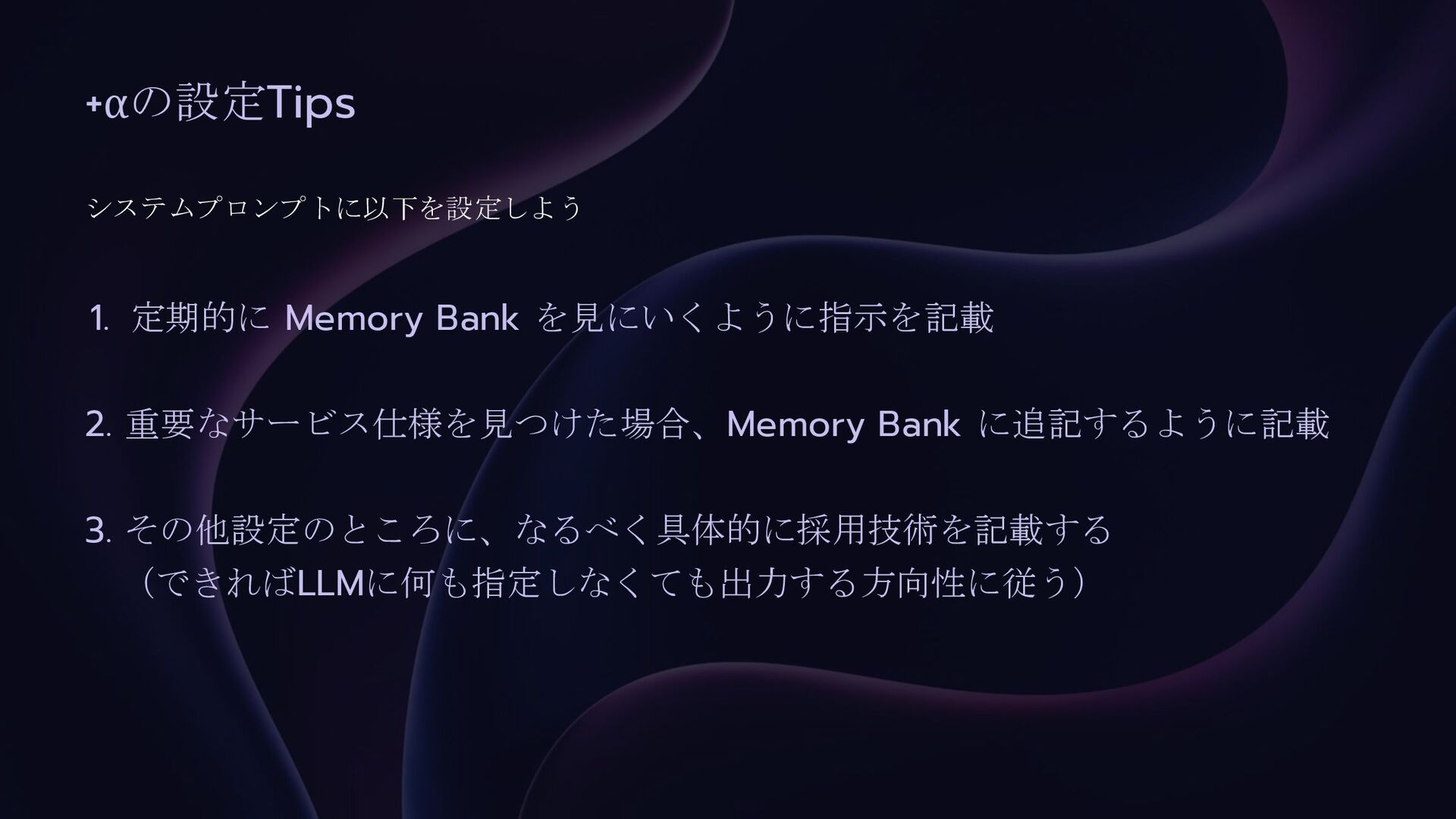 +αの設定Tips 1. 定期的に Memory Bank を見にいくように指示を記載 2. 重要なサービス仕様を見つけた場合、Memory Bank に追記するように記載