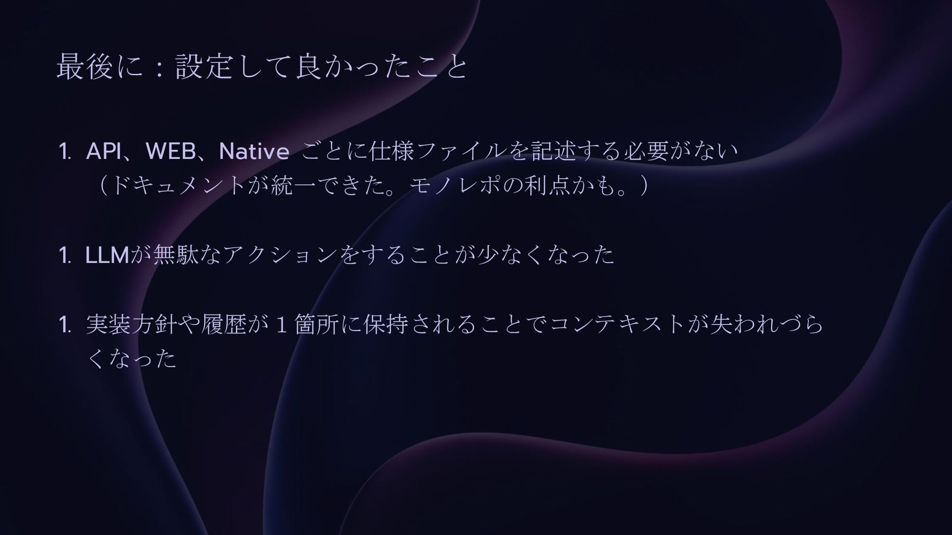 最後に:設定して良かったこと 1. API、WEB、Native ごとに仕様ファイルを記述する必要がない (ドキュメントが統一できた。モノレポの利点かも。) 1. LLMが無駄なアクションをすることが少なくなった 1. 実装方針や履歴が1箇所に保持されることでコンテキストが失われづら くなった