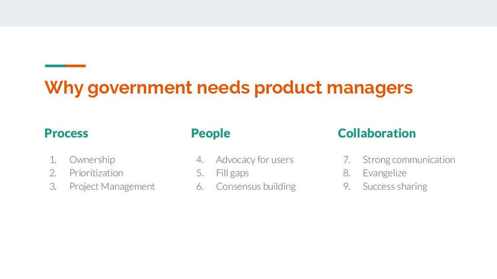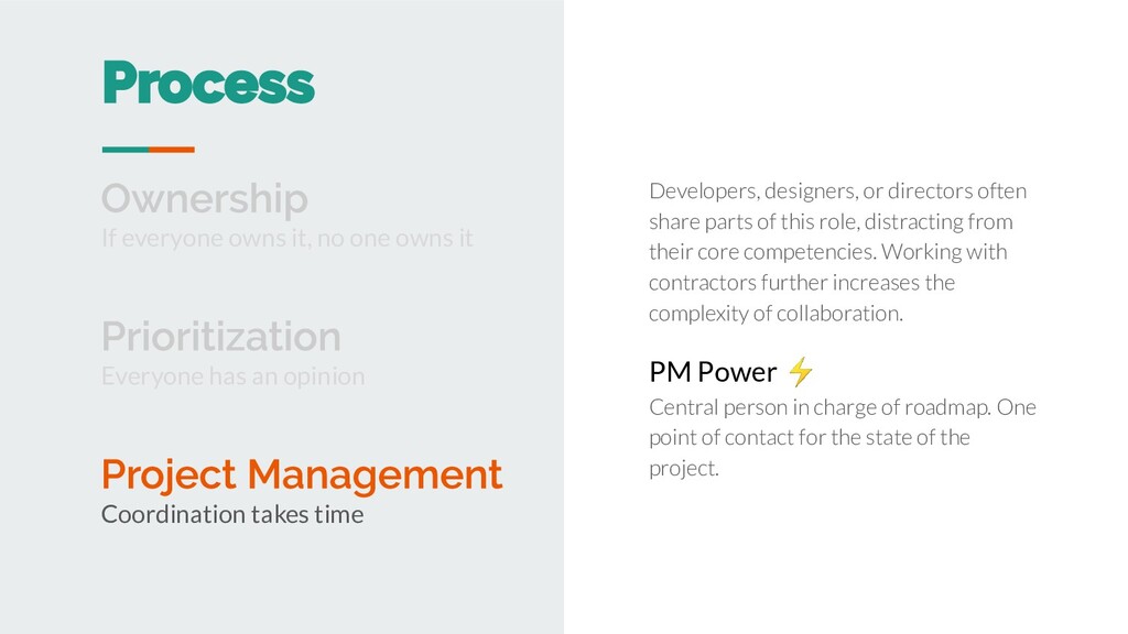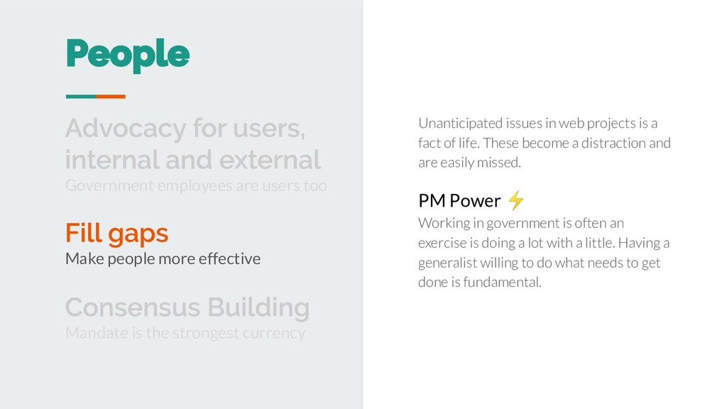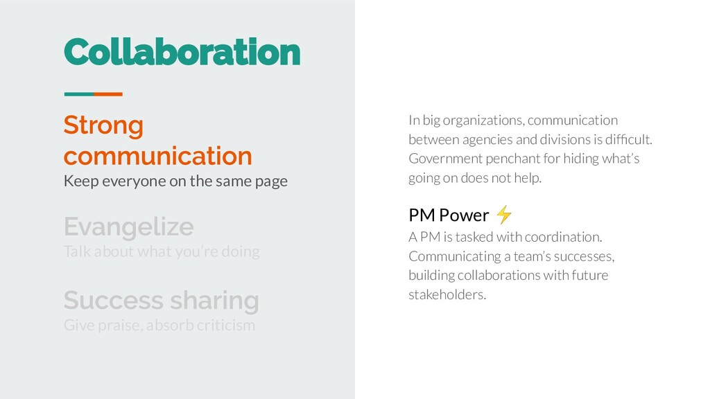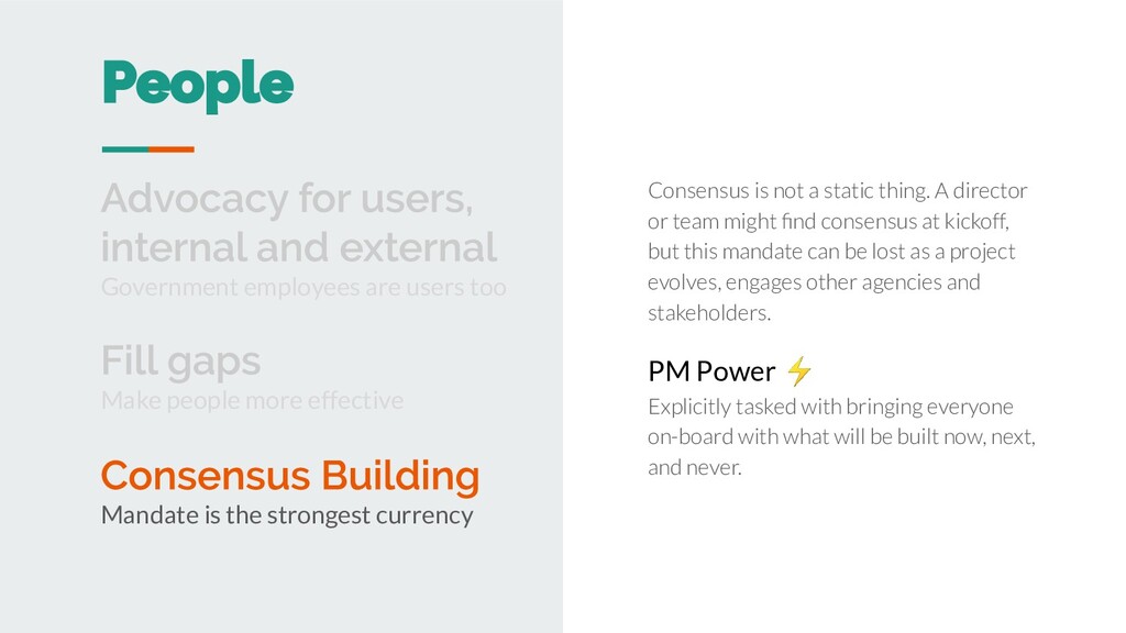 thing. A director or team might find consensus at kickoff, but this mandate can be lost as a project evolves, engages other agencies and stakeholders. PM Power ⚡ Explicitly tasked with bringing everyone on-board with what will be built now, next, and never. Make people more effective Mandate is the strongest currency