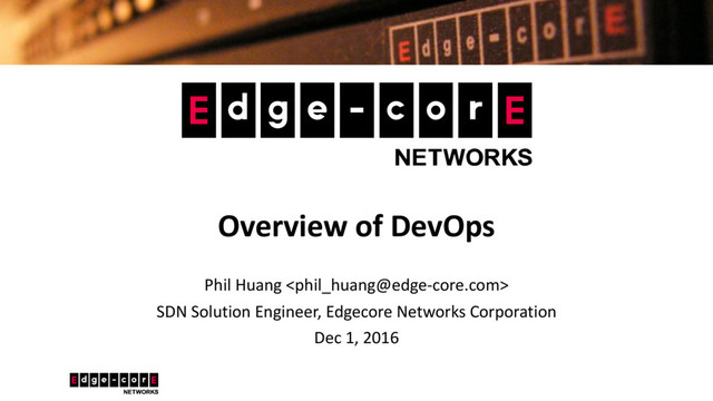 | www.edge-core.com You Workflow 1. Launch VM 2. Setting environment 3. Install applications 4. Quick start 5. Develop 6. Compile 7. Re-install application Choose Hypervisor, CPU, RAM, Disk size, location Bash, vim, dependency package View INSTALL file View README files View Developer’s Guide