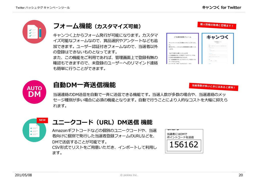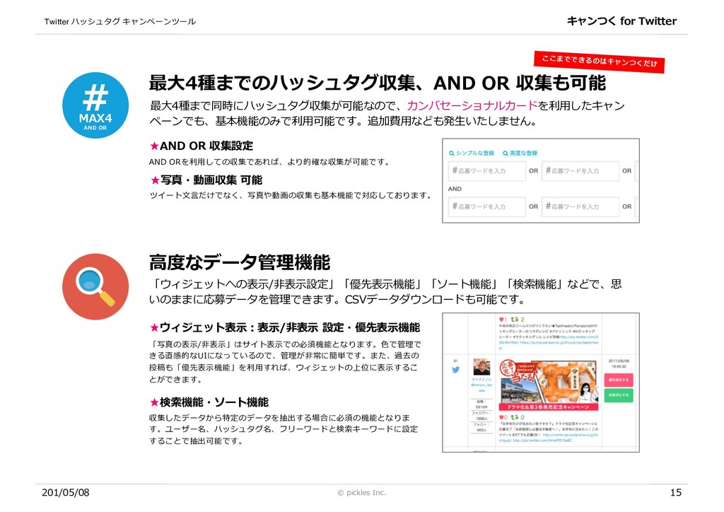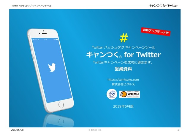 [email protected] 「キャンつく お問合せ担当」まで。お気軽にお問合せください。 具体的に導⼊したい案件なども教えていただければスムーズに導⼊が可能です。 社名 株式会社ピクルス 本社所在地 〒160-0004 東京都新宿区四⾕1丁⽬7 第3⿅倉ビル5F 設⽴ 2003年9⽉ 資本⾦ 1000万円 WEBサイト http://pickles.tv 事業内容 デジタル広告の企画・制作。デジタルサービスの企画・制作。 主要取引先 ASUS JAPAN株式会社 / アドビ システムズ 株式会社 / アサヒビール株式会社 / パナソニック株式会社 / 株式会社講談社 / NTTレゾナ ント株式会社 / ソニーネットワークコミュニケーションズ株式会社 / 株式会社スクウェア・エニックス・ホールディングス / 東宝東和株 式会社 / ⼀般社団法⼈ ⽇本⾃動⾞連盟 (JAF) / LinkedIn / 株式会社テレビ朝⽇ / 株式会社 アサツーディ・ケイ / 株式会社 ⼤広 / 株 式会社 電通 / 株式会社 ぐるなび / 株式会社 博報堂 / 株式会社 読売広告社 / 株式会社 ⼩⽥急エージェンシー / 株式会社 東急エージェ ンシー / 株式会社 マッキャン・ワールドグループ ホールディングス / 他 ※ピクルスはWOM(クチコミ)マーケティング協議会へ加⼊しており、健全なクチコミマーケティングを推進しております。