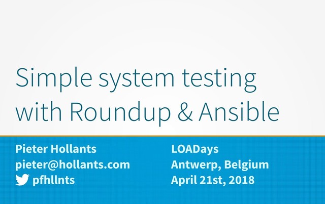 In this talk I want to introduce you to a much simpler alternative that doesn't require a dedicated programming language stack such as Python or Ruby: roundup. roundup is a really itsy-bitsy-tiny little rapper that adds just enough around your off-the-shelf Bash test functions to run isolated and get easy overviewable test results. If this doesn't make you immediately roll with your eyes for fear of a maintenance nightmare, let me remind you how our well-established Un*x heritage of tools and plumbing allows us to even test our mail server's basic functionality without needing 31337 add-on libraries. For the bravest (or craziest, depending on the viewpoint) among you, I will show how dynamic test generation takes us close to the border of language abuse.