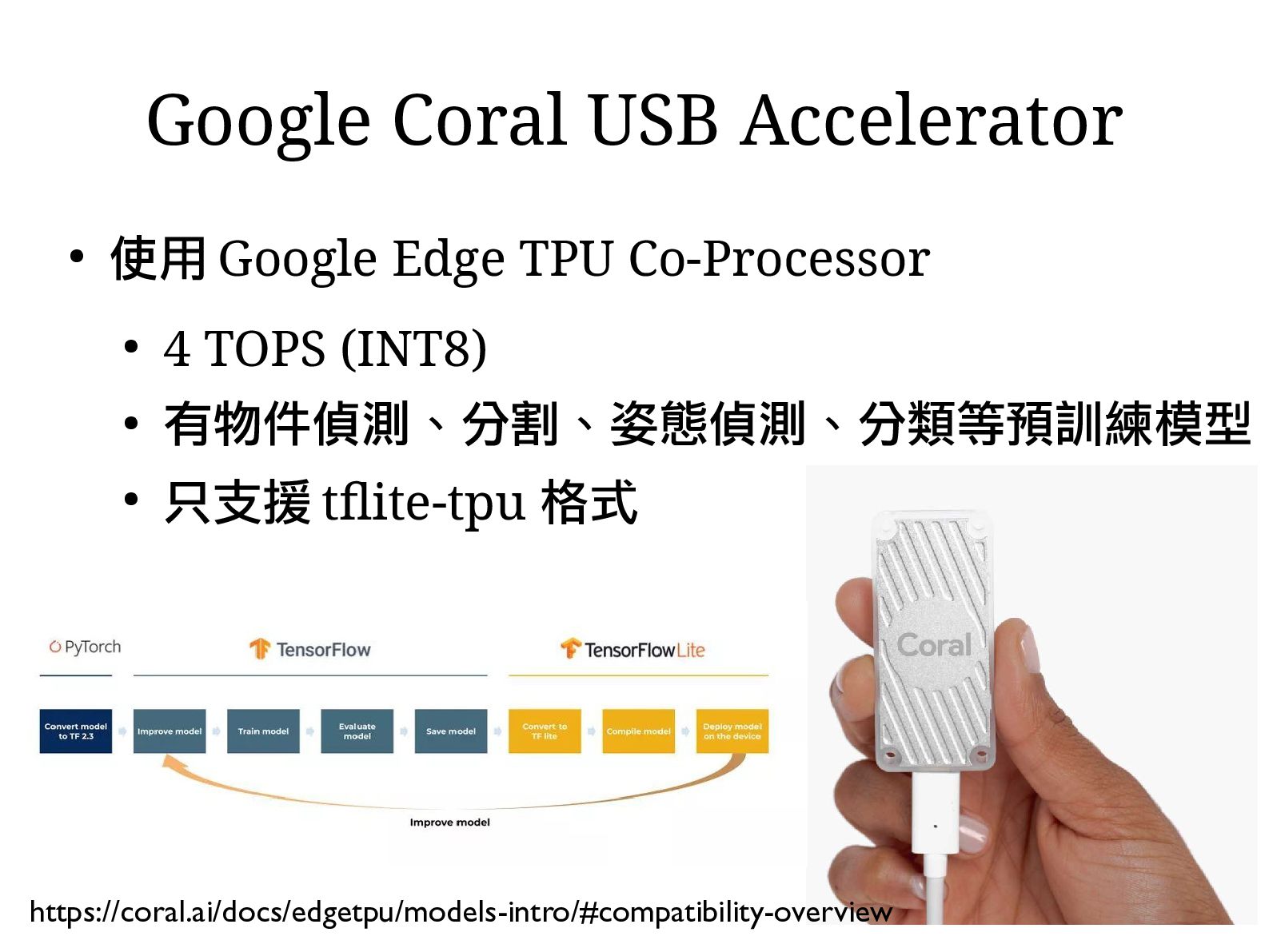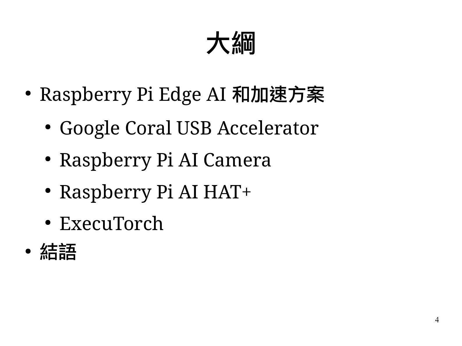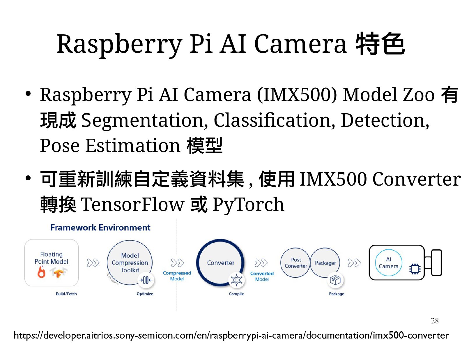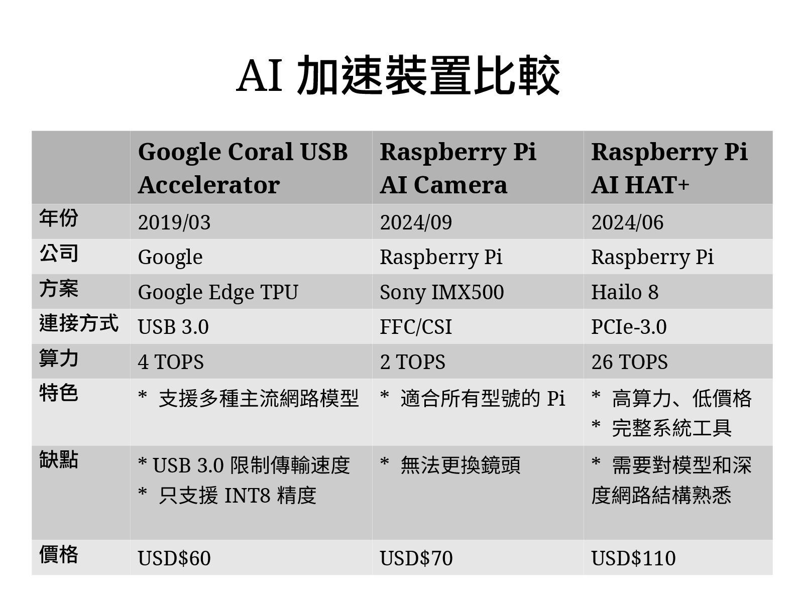 我們這次分享將介紹 Raspberry Pi 的軟硬體加速方案,包括 Google Coral Accelerator 做加速、使用 Raspberry Pi AI Camera、使用 Raspberry Pi AI HAT+ 和使用 ExecuTorch 軟體方案。