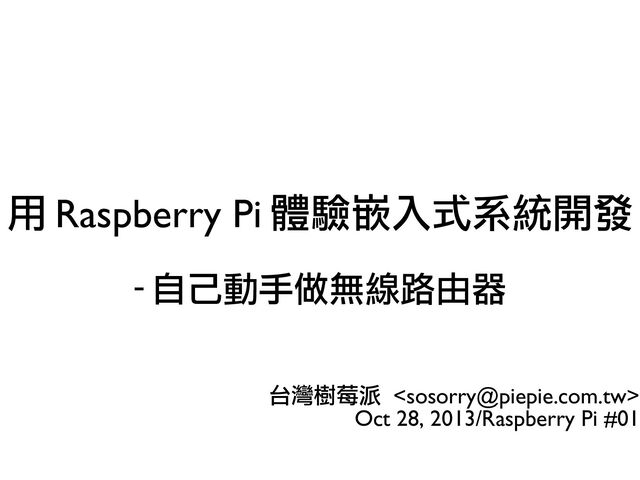 • GPU: Broadcom VideoCore IV, OpenGL ES 2.0, 1080p30 H.264/MPEG-4 AVC decoder • Memory: 512 Mb SDRAM • Video outputs: Composite, HDMI • Audio outputs: 3.5 mm jack, HDMI • Onboard storage: SD, MMC, SDIO card slot • Onboard 10/100 Ethernet RJ45 Raspberry Pi 硬體規格 (Model B)