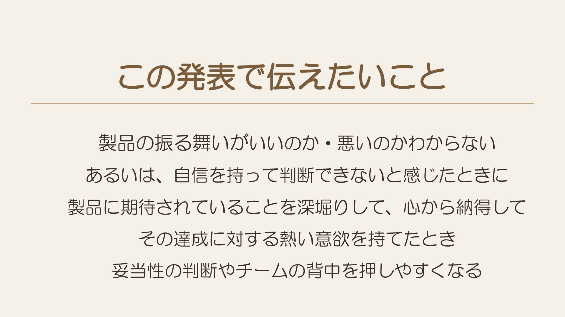 この発表で伝えたいこと 製品の振る舞いがいいのか・悪いのかわからない あるいは、自信を持って判断できないと感じたときに 製品に期待されていることを深堀りして、心から納得して その達成に対する熱い意欲を持てたとき 妥当性の判断やチームの背中を押しやすくなる
