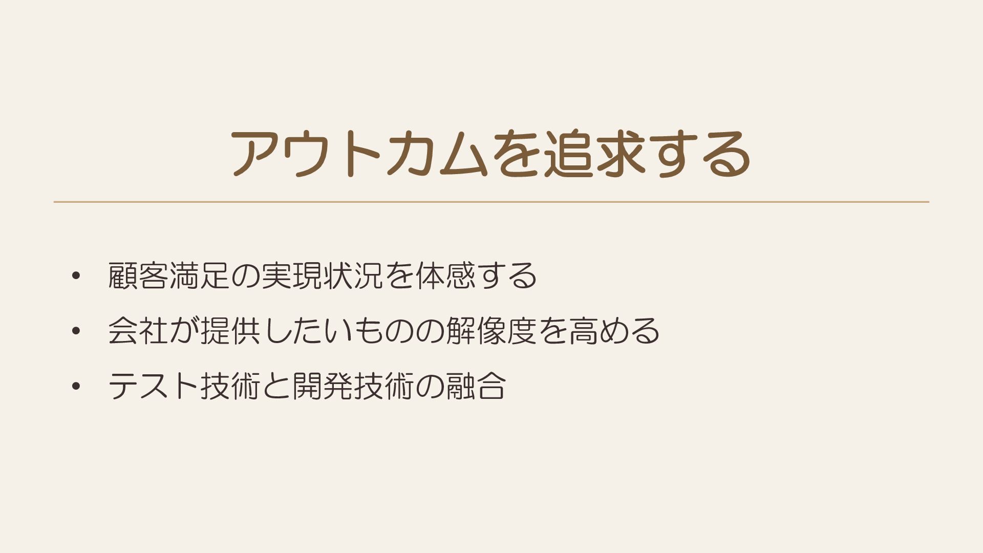 アウトカムを追求する • 顧客満足の実現状況を体感する • 会社が提供したいものの解像度を高める • テスト技術と開発技術の融合