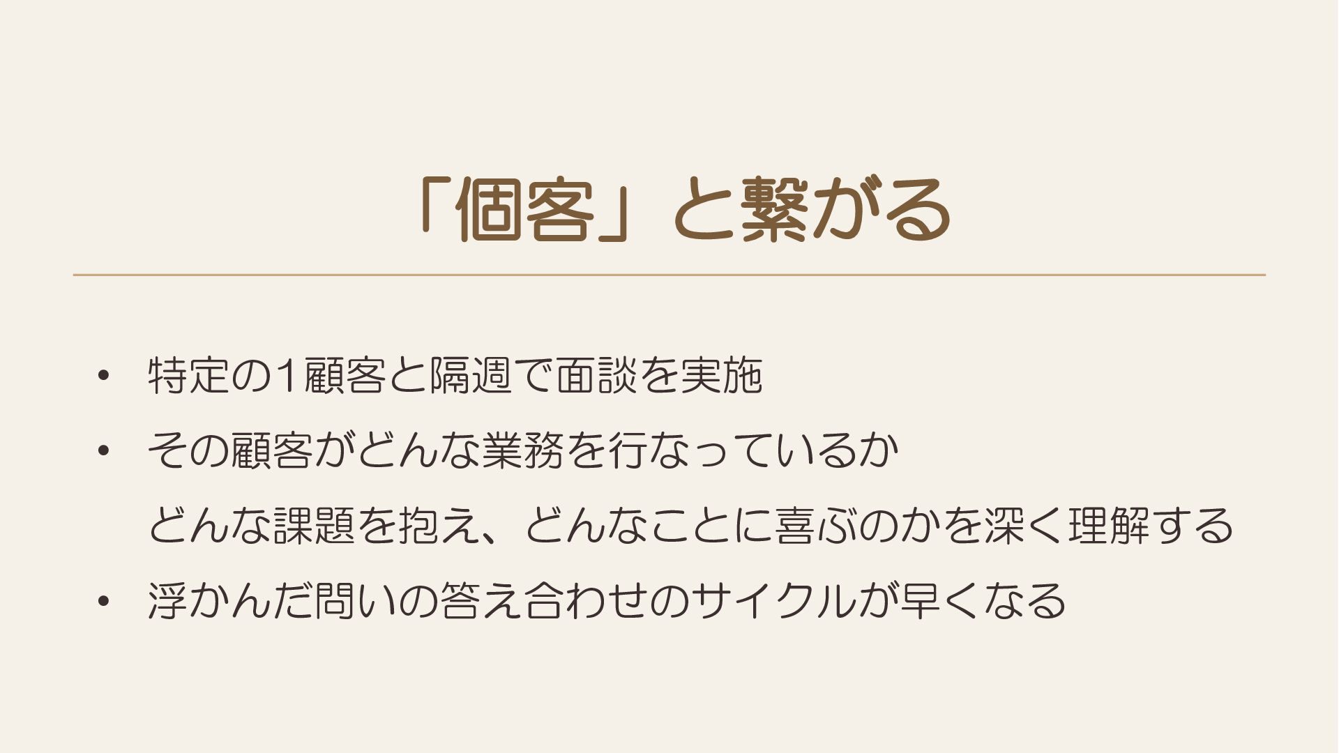 「個客」と繋がる • 特定の1顧客と隔週で面談を実施 • その顧客がどんな業務を行なっているか どんな課題を抱え、どんなことに喜ぶのかを深く理解する • 浮かんだ問いの答え合わせのサイクルが早くなる