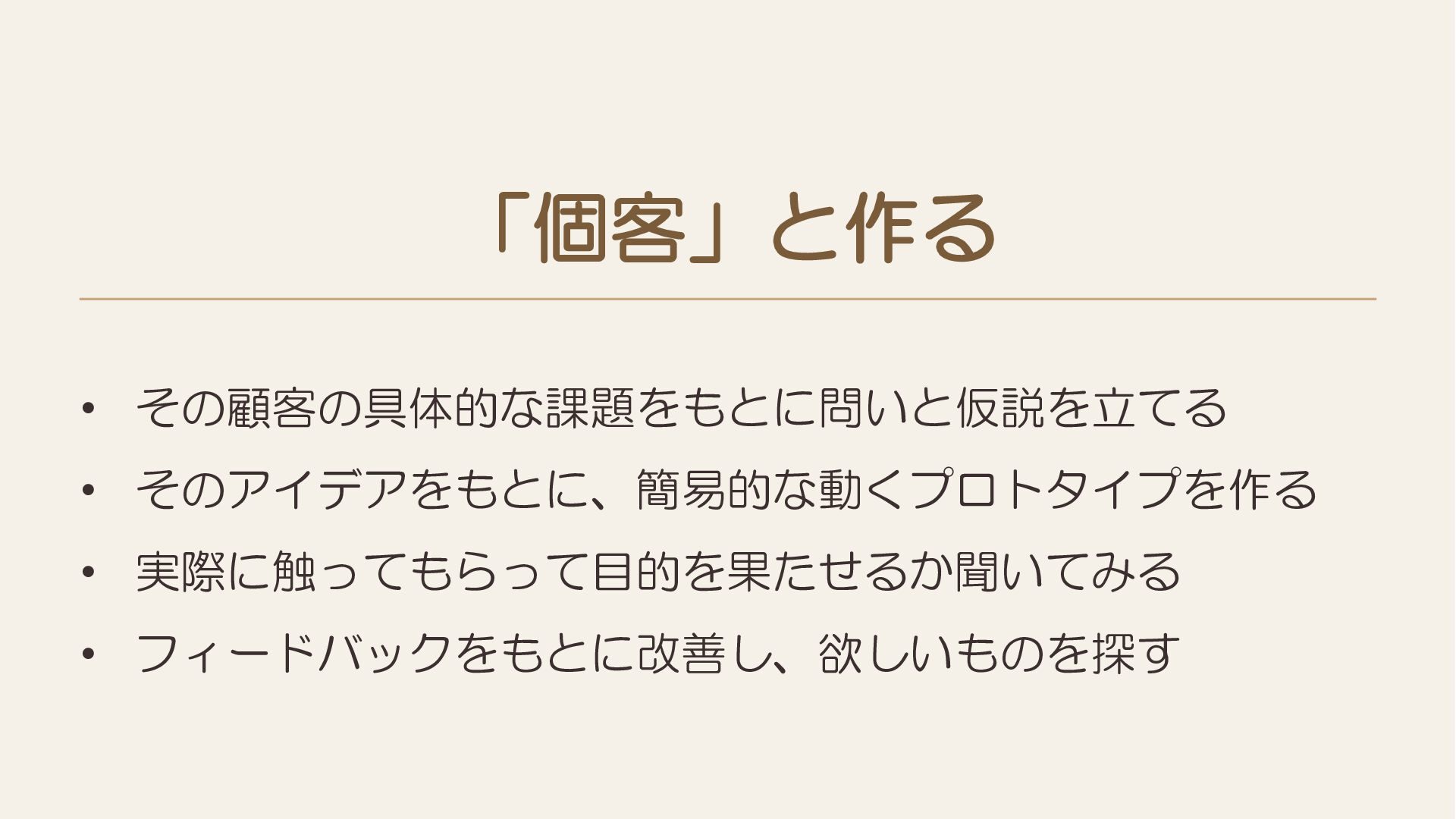 • その顧客の具体的な課題をもとに問いと仮説を立てる • そのアイデアをもとに、簡易的な動くプロトタイプを作る • 実際に触ってもらって目的を果たせるか聞いてみる • フィードバックをもとに改善し、欲しいものを探す 「個客」と作る