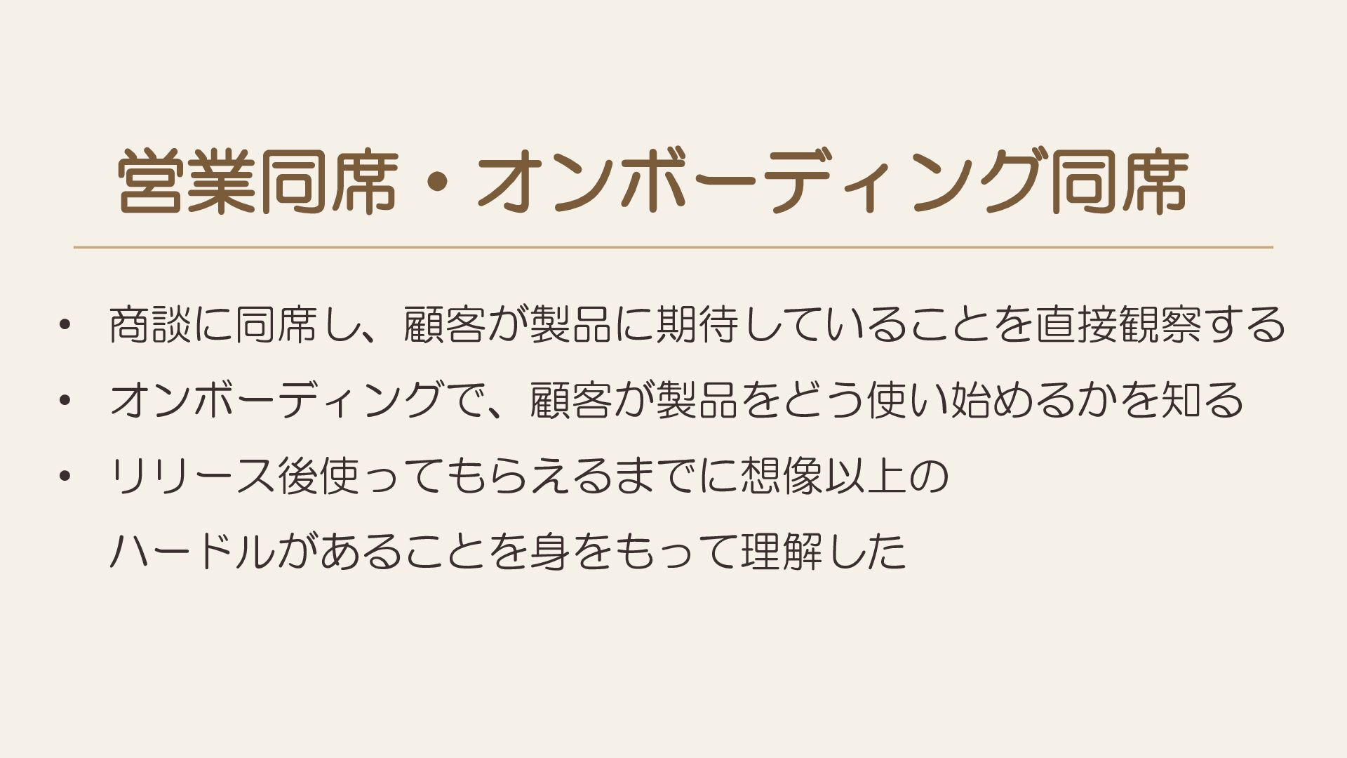 営業同席・オンボーディング同席 • 商談に同席し、顧客が製品に期待していることを直接観察する • オンボーディングで、顧客が製品をどう使い始めるかを知る • リリース後使ってもらえるまでに想像以上の ハードルがあることを身をもって理解した