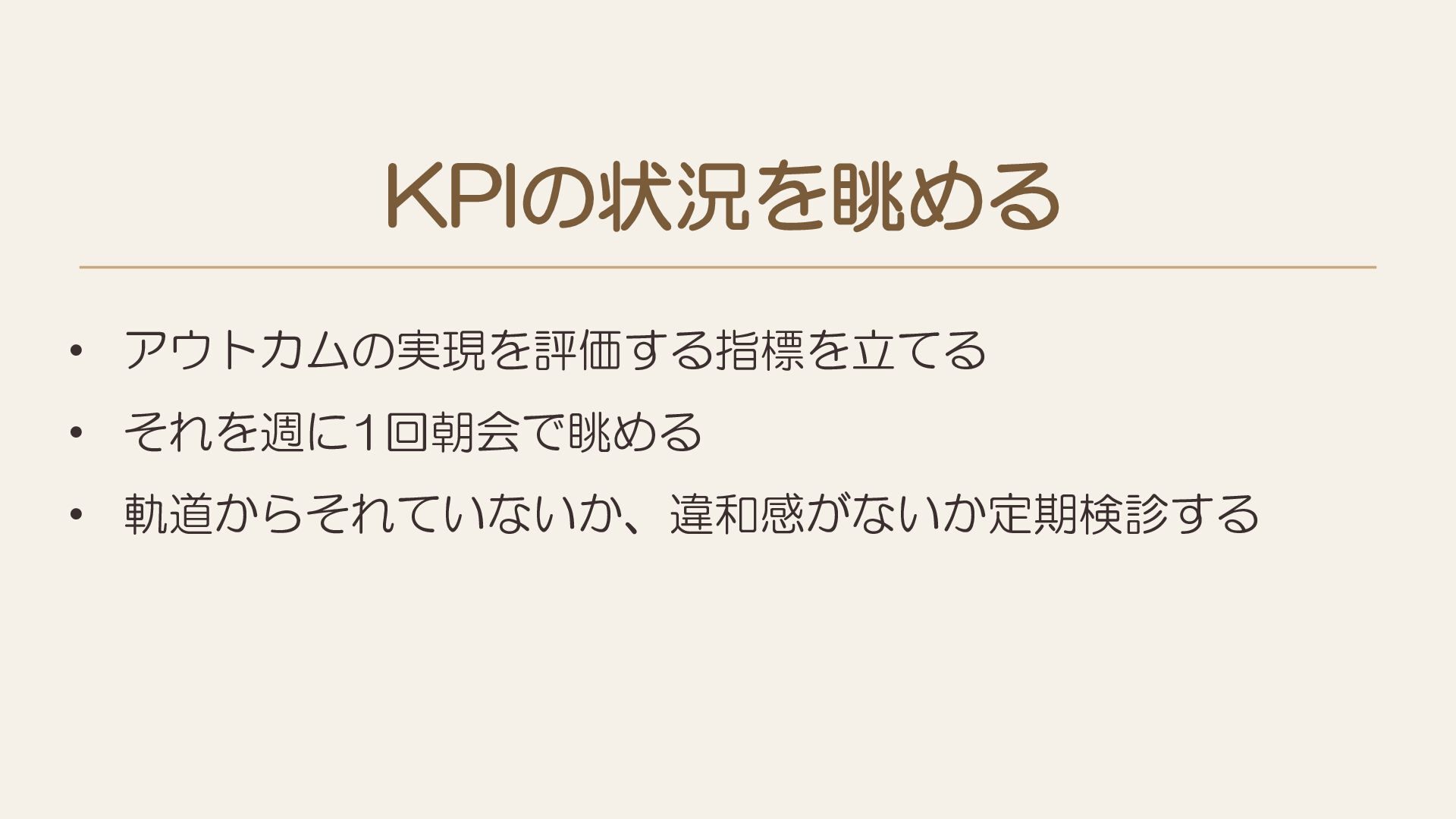 KPIの状況を眺める • アウトカムの実現を評価する指標を立てる • それを週に1回朝会で眺める • 軌道からそれていないか、違和感がないか定期検診する