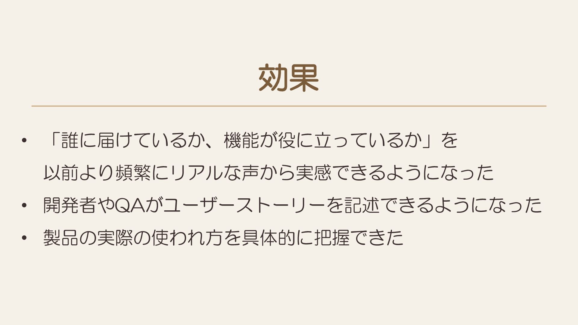 効果 • 「誰に届けているか、機能が役に立っているか」を 以前より頻繁にリアルな声から実感できるようになった • 開発者やQAがユーザーストーリーを記述できるようになった • 製品の実際の使われ方を具体的に把握できた