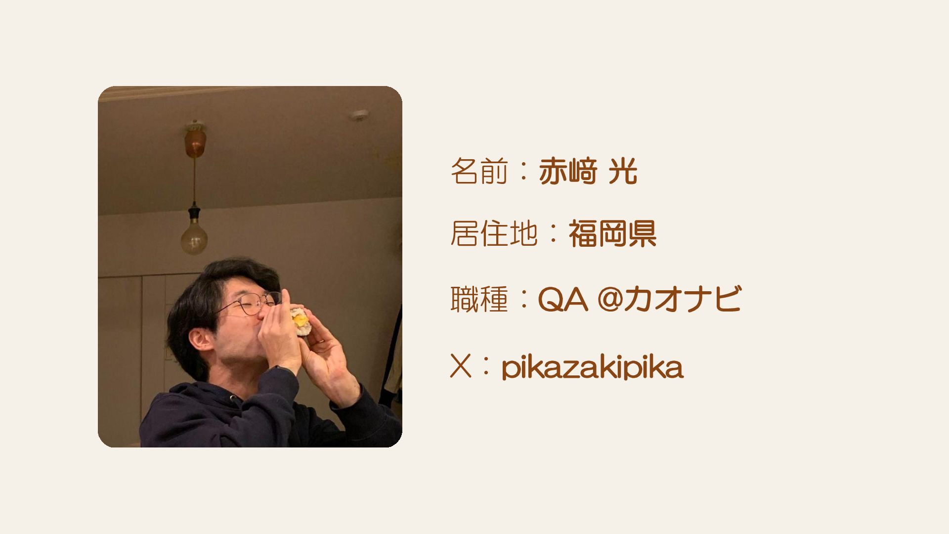 名前:赤﨑 光 居住地:福岡県 職種:QA @カオナビ X:pikazakipika