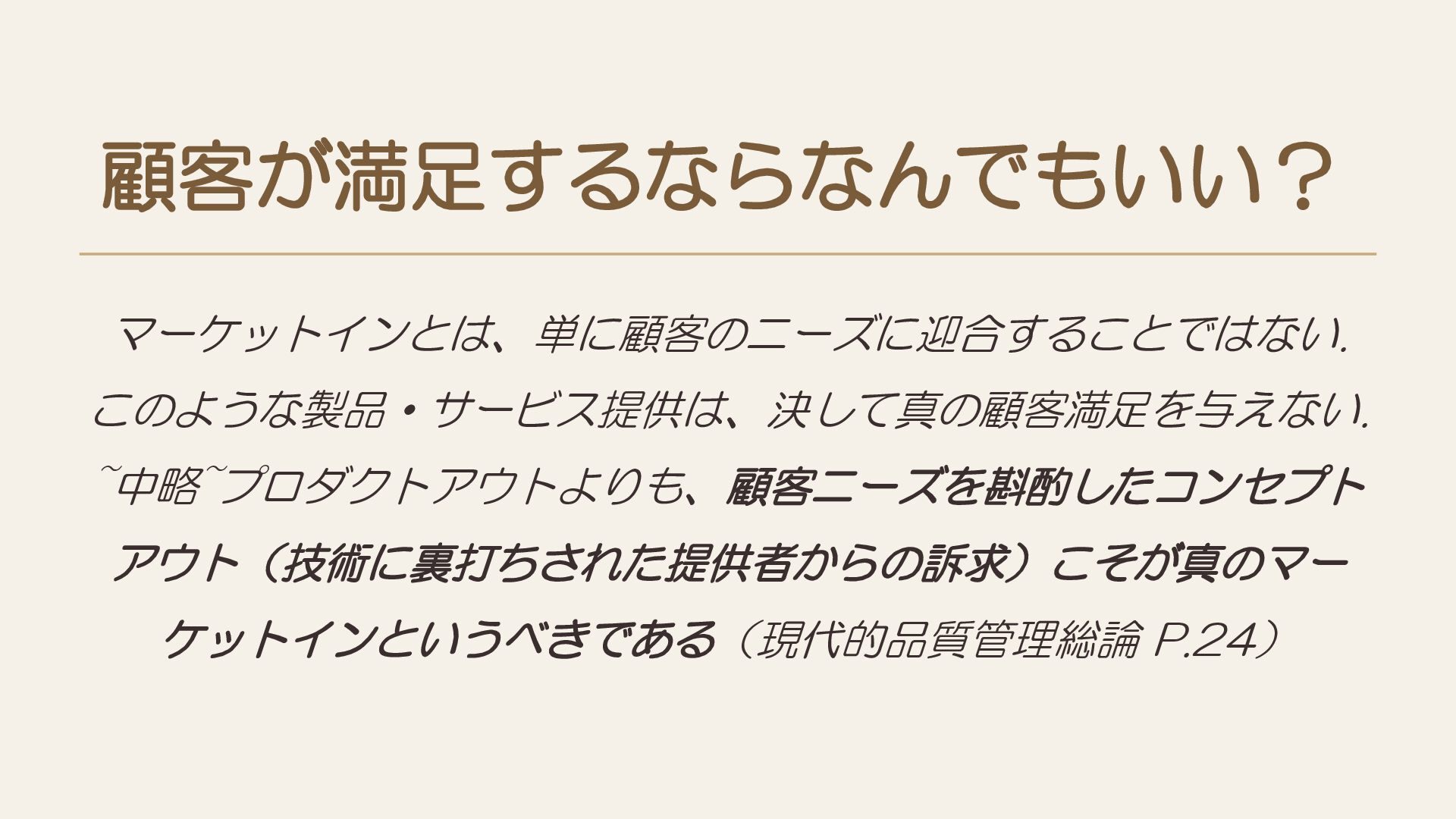 顧客が満足するならなんでもいい? マーケットインとは、単に顧客のニーズに迎合することではない. このような製品・サービス提供は、決して真の顧客満足を与えない. ~中略~プロダクトアウトよりも、顧客ニーズを斟酌したコンセプト アウト(技術に裏打ちされた提供者からの訴求)こそが真のマー ケットインというべきである(現代的品質管理総論 P.24)